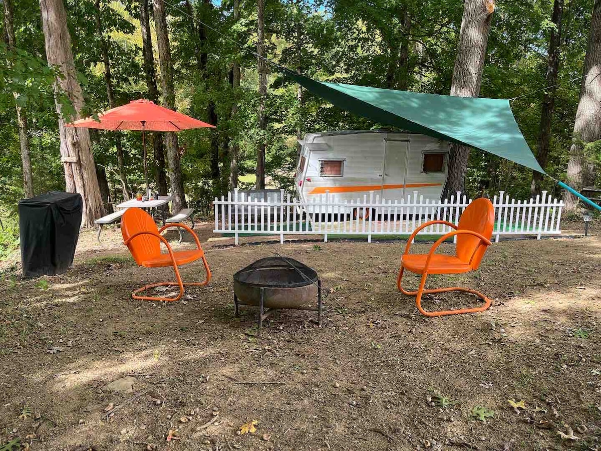 Make great memories! Reconnect with nature at this unforgettable escape. *please note* after Labor Day the lake level drops and no lake by the end of September. A peaceful creek in Fall and Winter. This listing is for the trailer named Tangerine Dream. She has a half bed ( between a full and twin) also a dinette that converts into a twin. A/C,mini fridge,fire pit and grill, in a shady spot overlooking the lake. Also, you can rent the whole glampground!