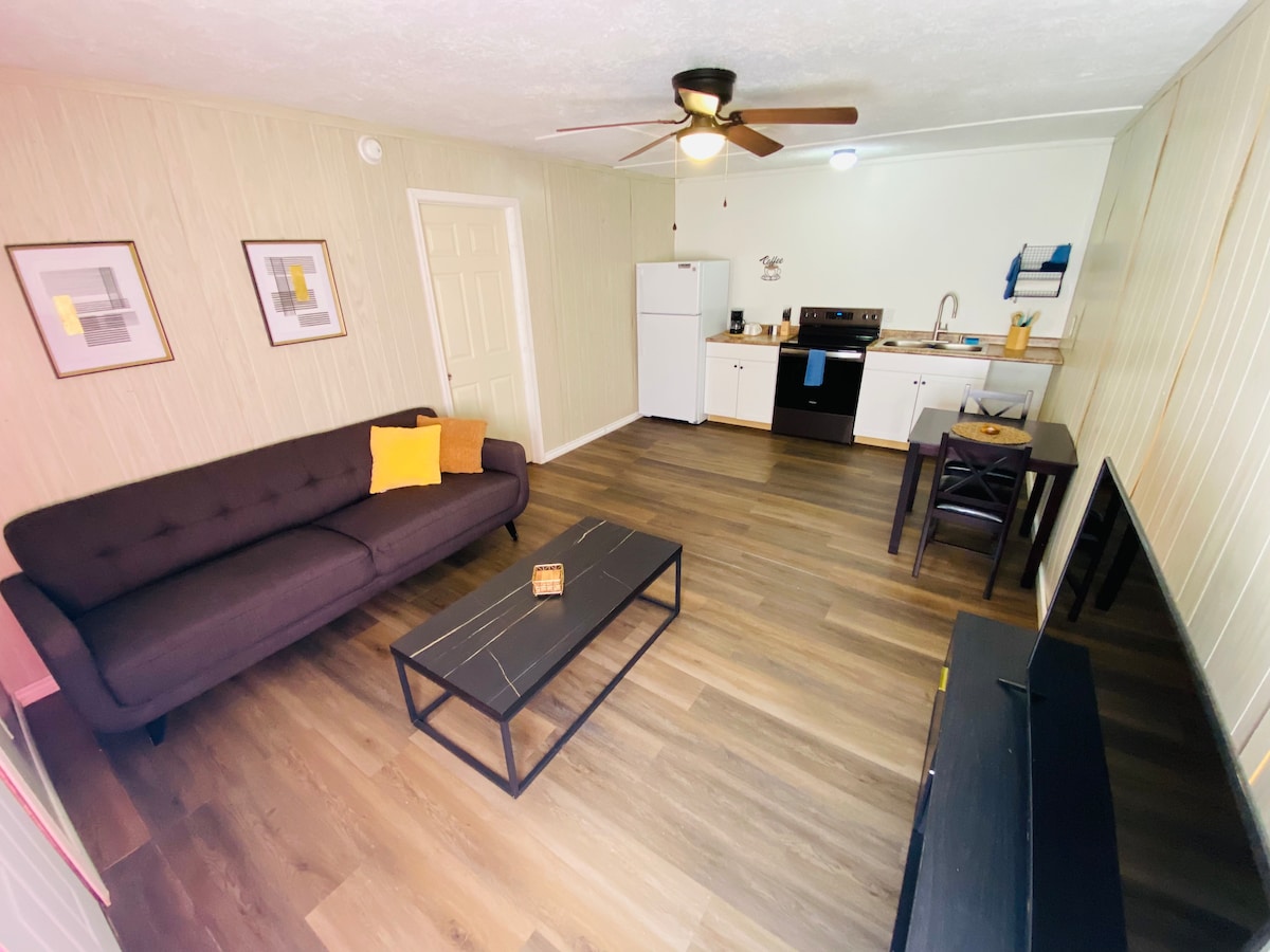Newly remodeled, cozy apartment with all new furnishings. Host lives on premises below. Enjoy peace and tranquility with everything you need. Coffee Maker, Full Fridge with ice machine, full kitchen with bar top and stools. Loveseat and chair with Smart TV + Wifi One bedroom with Queen Size Bed, closet, nightstand and TV with blackout curtains. Full bathroom with stand up shower. Towels provided. Washer and Dryer available downstairs. Outside camera on property ***No parties, smoking or pets***