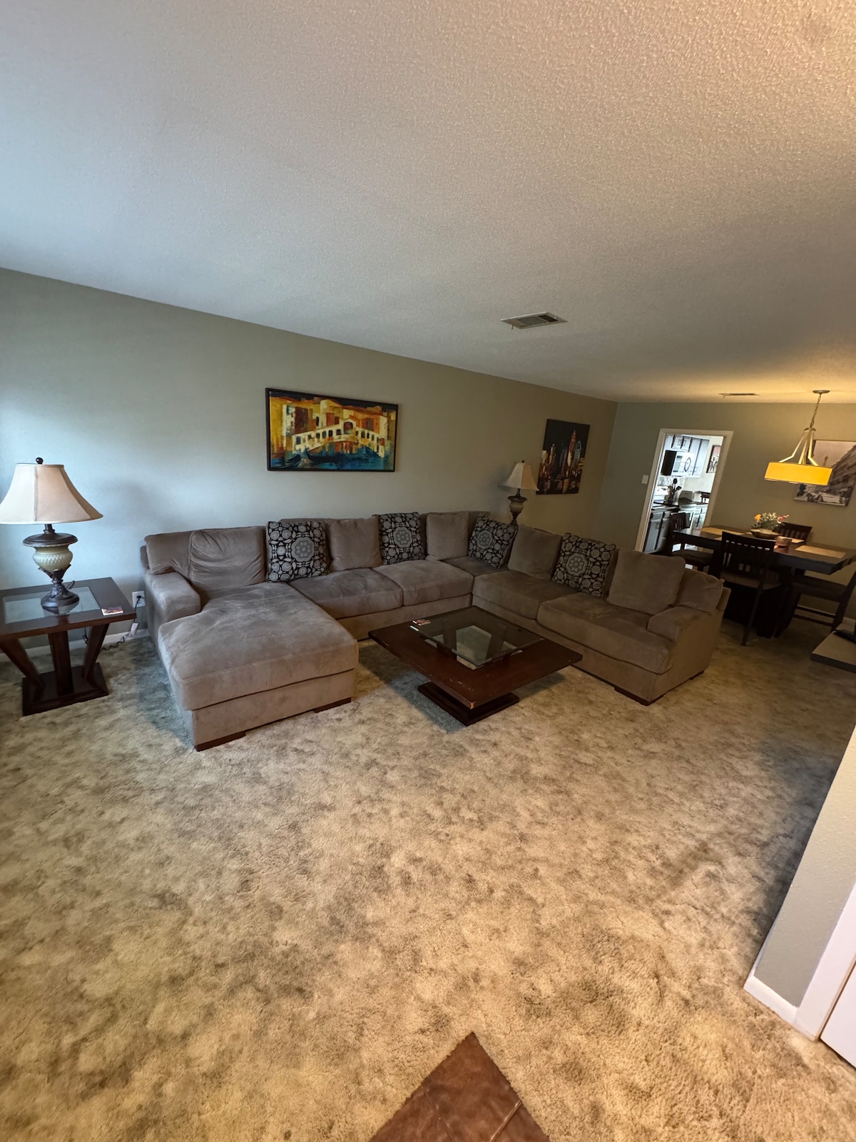 This beautiful 3-bedroom home boasts 2 full bathrooms, a spacious 2-car garage and accommodates up to 8 guests. The living room features high vaulted ceilings complemented by a cozy gas fireplace, while the serene backyard patio offers a comfortable sectional, a gas fire pit, a BBQ grill, and a large TV. Ideal for families and professionals seeking a more comfortable and spacious alternative to a hotel room, and conveniently located just minutes away from major stores, restaurants and hospitals.