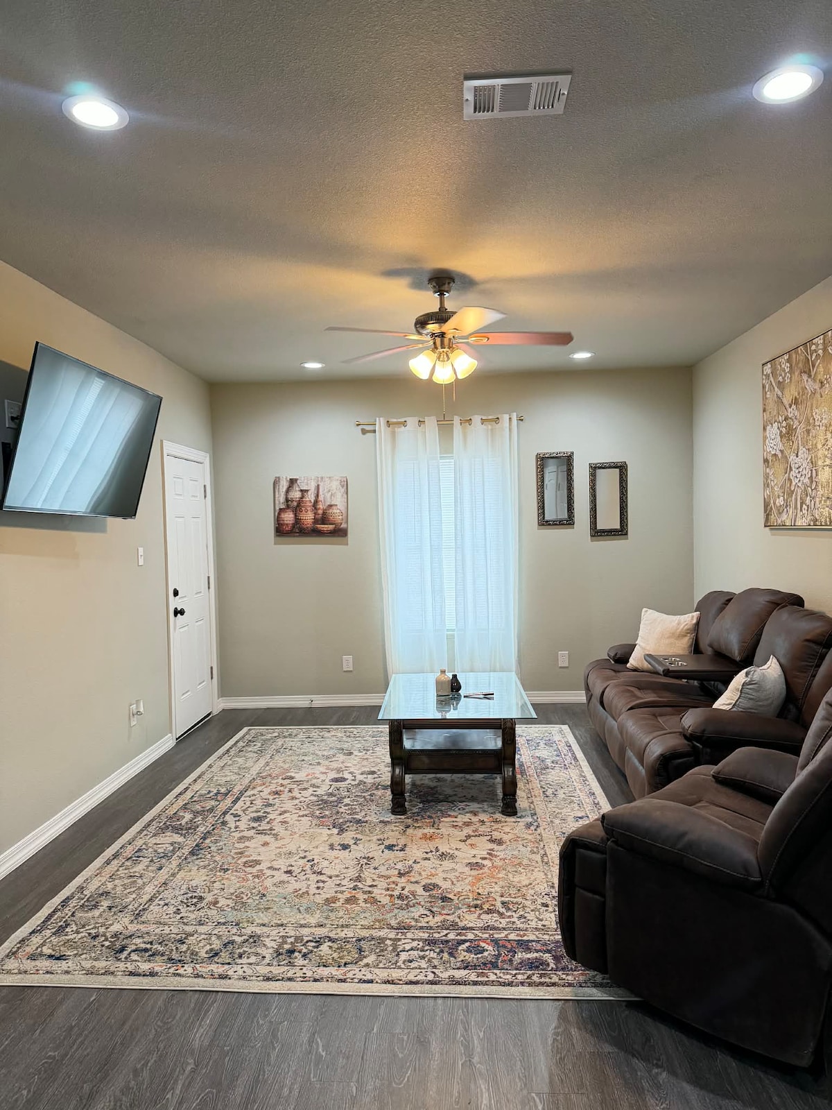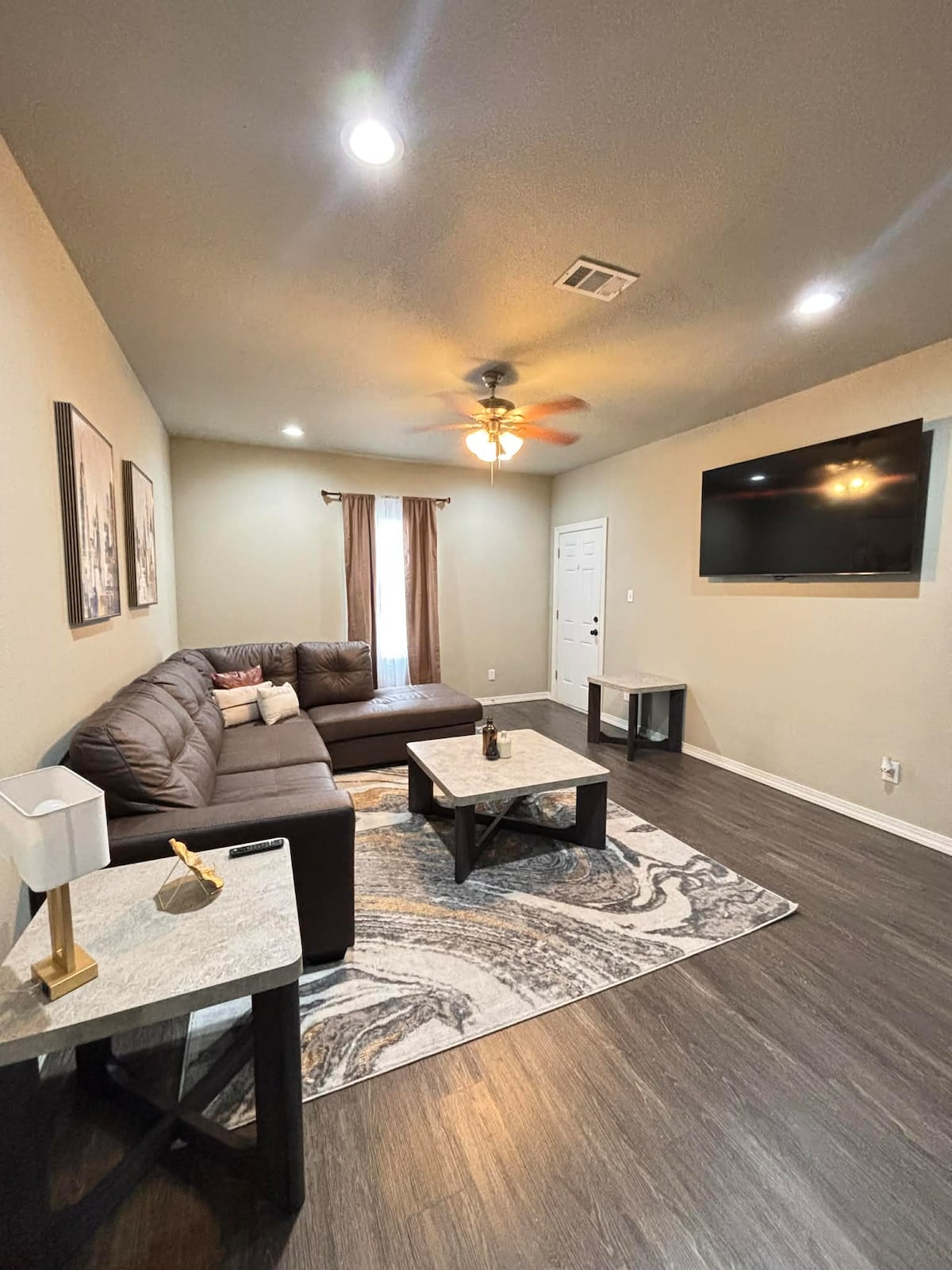 This beautiful 3-bedroom home boasts 2 full bathrooms, a spacious 2-car garage and accommodates up to 8 guests. The living room features high vaulted ceilings complemented by a cozy gas fireplace, while the serene backyard patio offers a comfortable sectional, a gas fire pit, a BBQ grill, and a large TV. Ideal for families and professionals seeking a more comfortable and spacious alternative to a hotel room, and conveniently located just minutes away from major stores, restaurants and hospitals.