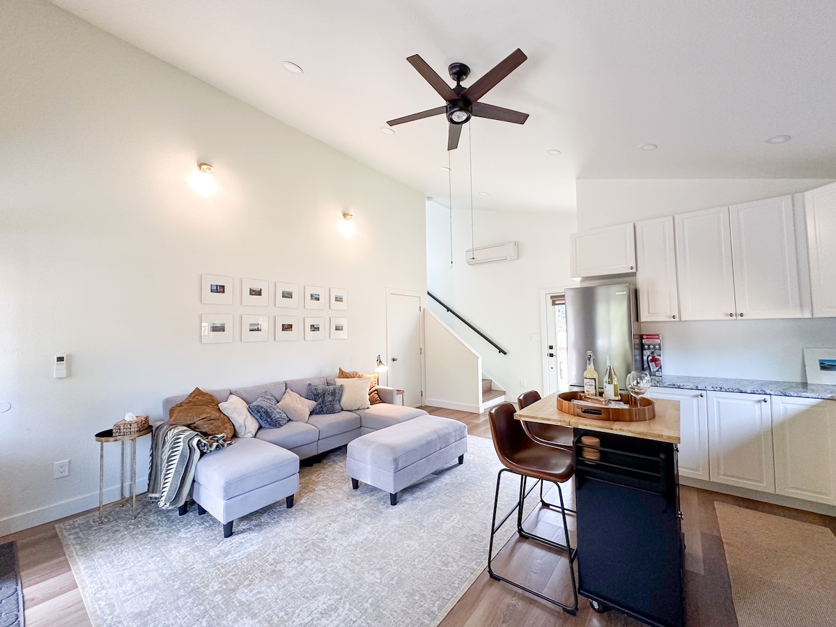 Watch the otters play and the boats sail past! 960 sq ft open plan apartment with great room, small well-equipped kitchen, propane fireplace, bedroom w/ comfy king bed & dressing area with sink, laundry room w/washer & dryer. There's a nook in the great room that houses a futon type full sized bed that can sleep two (smaller people or kids). The tall ceilings make it feel extra spacious and the windows let lots of light and views in.