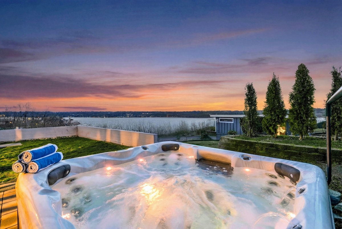Wake up to sweeping Sinclair Inlet views and watch Navy ships glide by from this newly remodeled 4-bed, 3-bath hillside retreat! Relax in the 8-person hot tub, gather around the firepit or grill on the deck. Inside, enjoy an open living area, spa-inspired primary suite, and family-friendly spaces including a bunk room and game area. Just minutes from the Bremerton–Seattle Ferry, Silverdale, and Pt Orchard, with Hood Canal adventures 30 minutes away. Your perfect Pacific Northwest escape awaits!