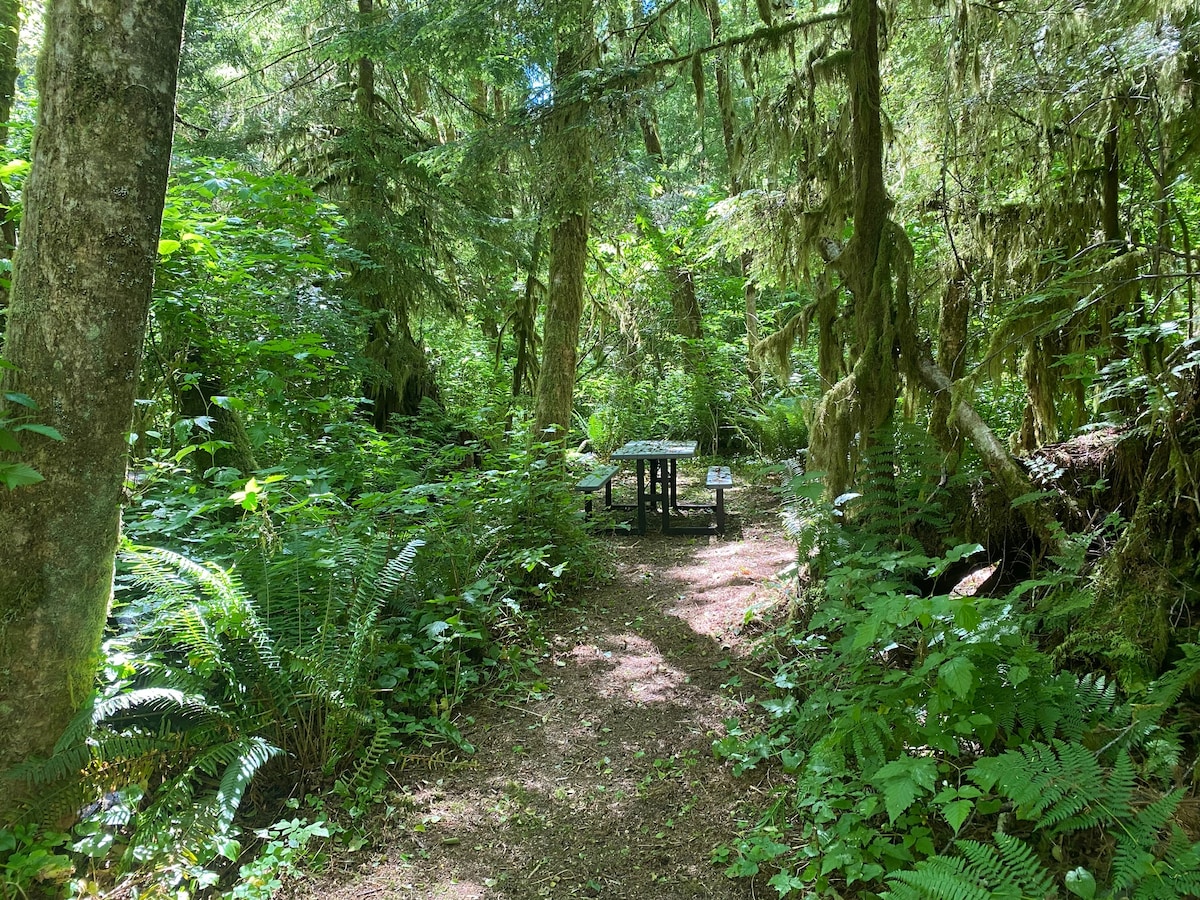 Find privacy and peace of mind in the setting of creekside rainforests. Basecamp comfortably with full dry coverage and basic kitchen items. Just 4 miles to Ruby Beach and close to the Hoh. 45 min south of Forks. Your dog will love it too! Rejuvenating sounds of flowing water, private trails through mossy tree canopy, and the beautiful flowing pool of Cedar Creek’s confluence await.