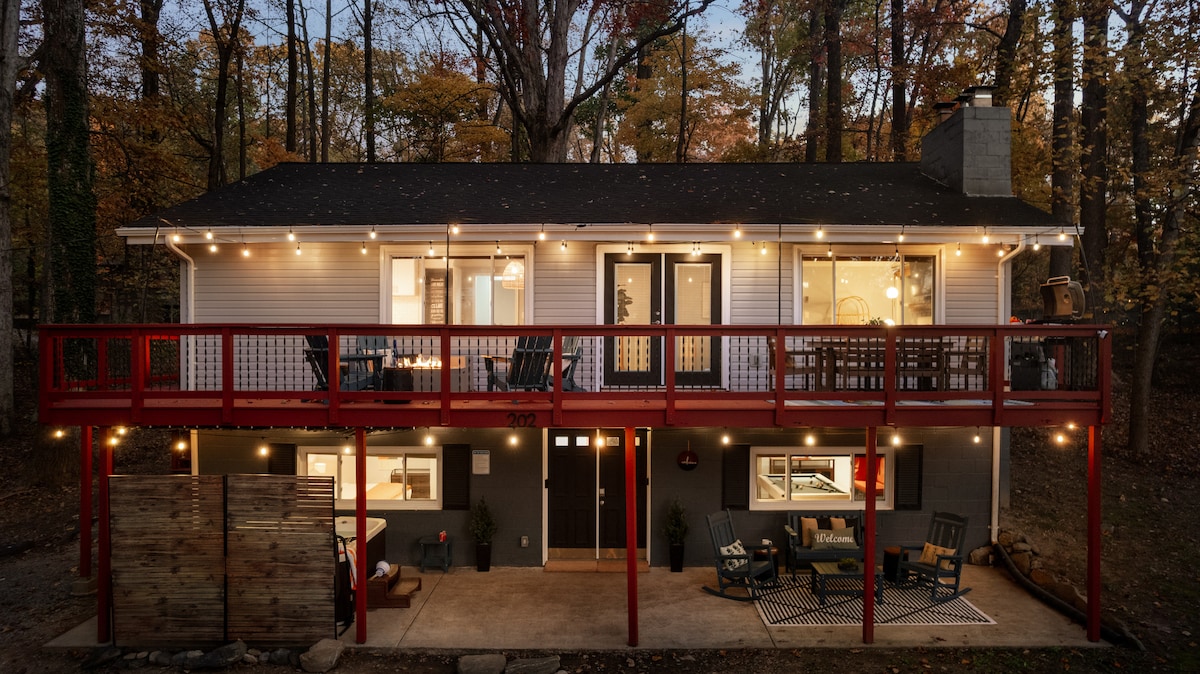 MOUNTAIN MAMA VACATION HOMES & CABINS Looking for a family-friendly getaway? This contemporary cottage has all the indoor and outdoor space you need, with a covered front porch, back deck, large flat yard, and a spacious kitchen. With an indoor fire place and an outdoor fire pit, you can enjoy the flames in any season! This house is steps from lovely Lake Shannondale which is beautiful year round. Work remotely (if you must!) with wifi speeds of 500 Mbps.