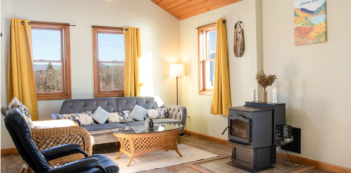 This rustic north country cabin offers 2 bedrooms and 1 bath for up to 4 guests. It has been renovated with comfortable beds and pillows, new appliances, a toasty pellet stove, a beautiful 75" TV with soundbar and subwoofer for movie nights, ample parking. It's located 9 minutes south of downtown Littleton and 11 minutes north of Cannon Mountain. Whether you're visiting for winter sports, leaf watching, mountaineering, or Polly's Pancakes, we're close to the action.
