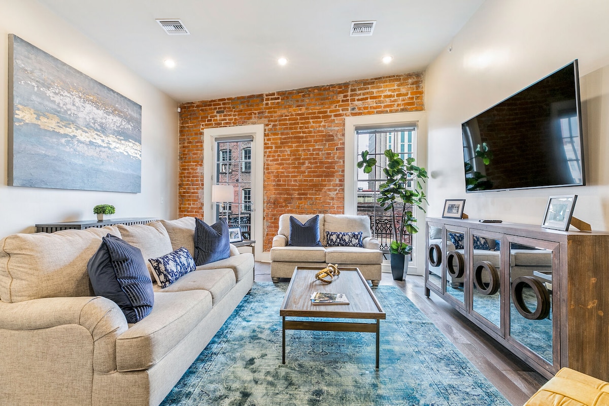 ⭑ Welcome to The Pontchartrain⭑ This stylish two-bedroom, two-bathroom suite features exposed brick, original wooden beams, and a spacious private outdoor area—blending New Orleans charm with upscale comfort. Perfect for couples, friends, or small groups, The Pontchartrain includes a fully equipped kitchen, indoor dining for six, and a bright living area in the heart of the Warehouse District. Just steps from the French Quarter, it’s your perfect base to explore the city.