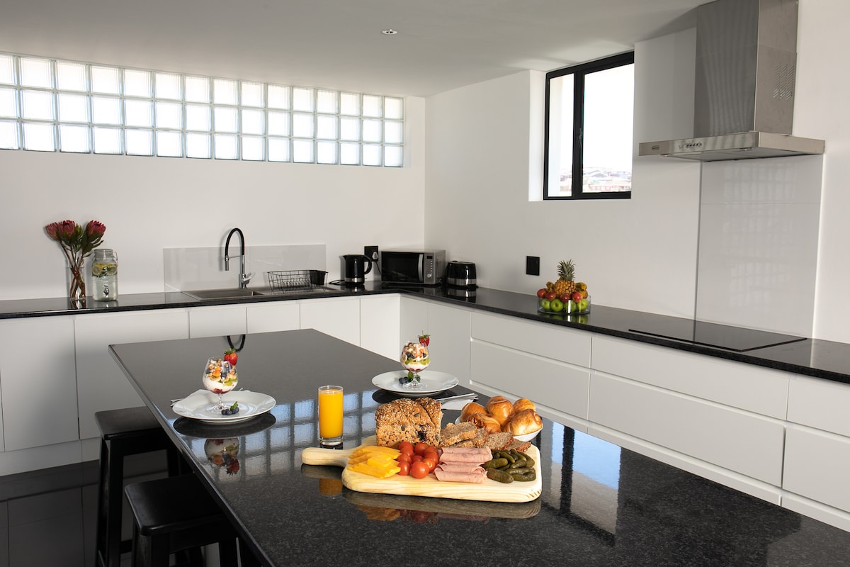 The first time we walked up the stairs and saw Jeffrey's Bay stretching in front of us, our hearts sang. After ten years of dreaming and two years of planning we finally created a modern beach front house by the surf. 127 de Gamma is built with a European style but an African heart. Whilst the bedrooms are downstairs, the open plan upstairs is all about the view. 2 guests may also stay in the unattached annex at the bottom of the garden. They have a totally separate area.