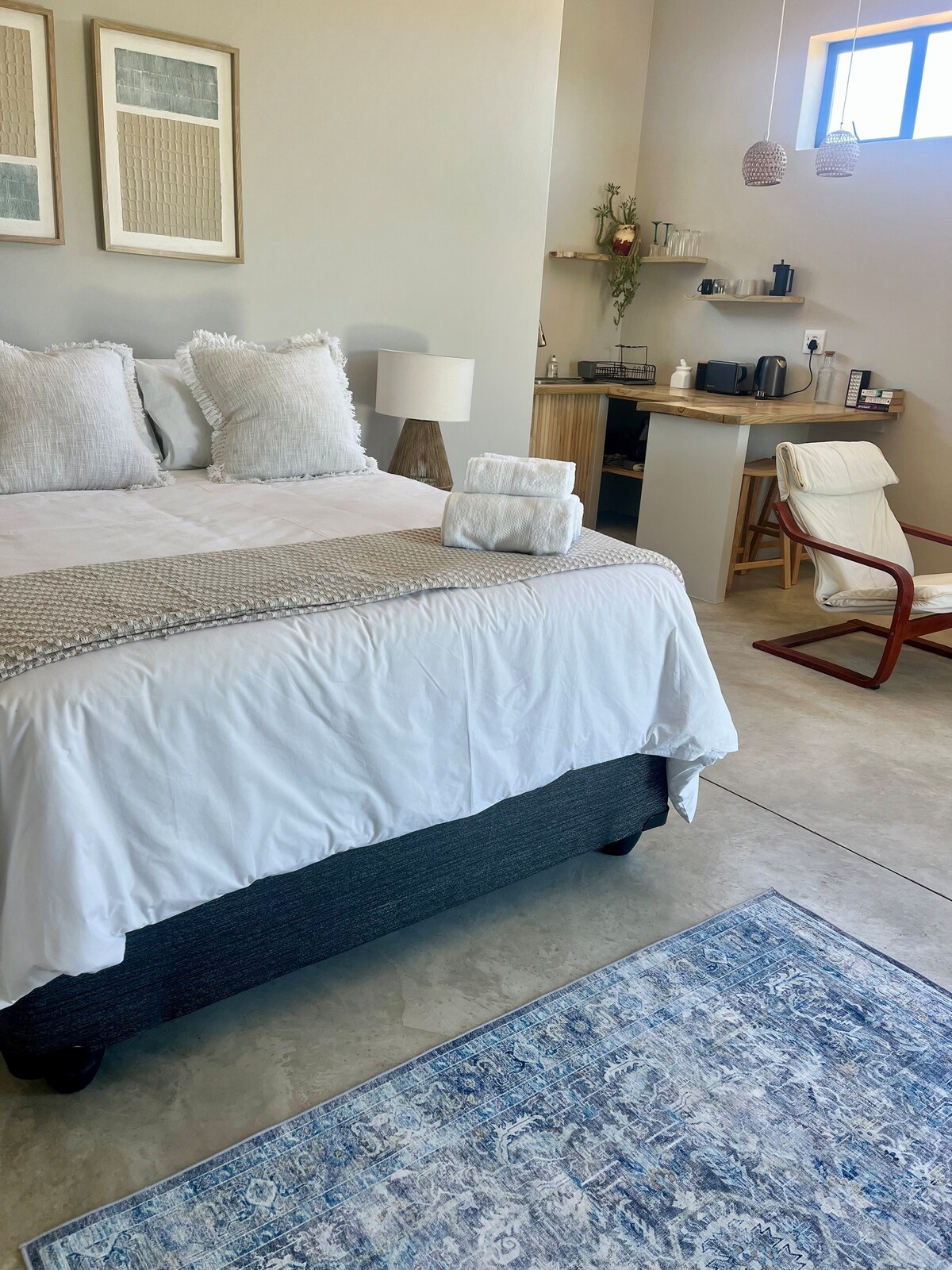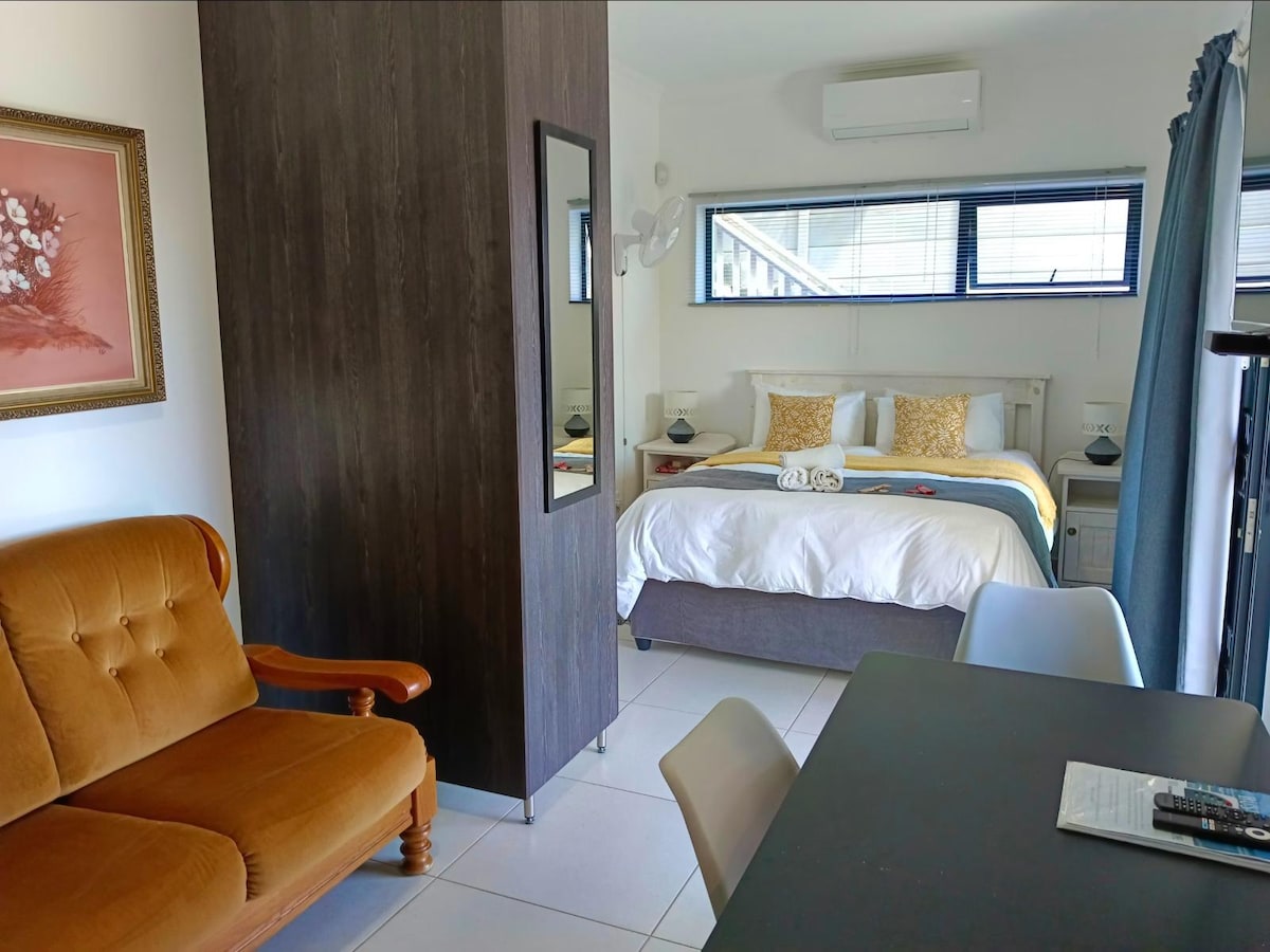 Tucked away in the quiet seaside of Aston Bay, Rustic Dune offers a retreat just 500m from the beach ideal for couples or solo travellers looking for a peaceful escape, yet close to the vibrant energy of Jeffreys Bay. The suite, situated on the ground floor of the main house accessible by stairs only, features a comfortable queen bed. It includes a convenient kitchenette and a modern bathroom with a walk-in shower. Included in the room are air-conditioning, smart TV, and Wi-Fi.