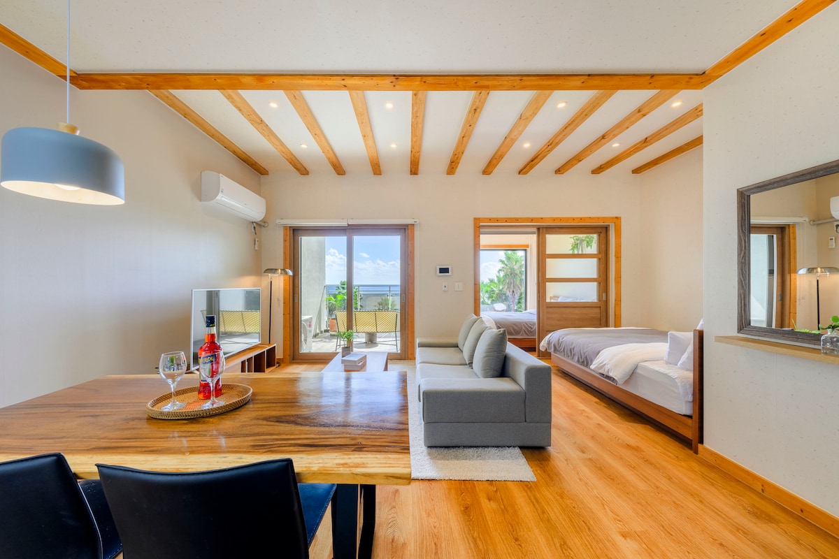 欢迎来到位于西归浦南元南太海岸路最安静、最悠闲地段的 Uplussea 别墅 (Uplussea Pension)。这是一个拥有私人海景的精致民宿,您可以通过落地窗,完整享受清澈湛蓝的济州南海岸风光。我们为小型旅行团体(情侣、朋友、家庭)准备了干净且富有格调的室内设计,以及高品质的床品。早晨在私人露台上享受咖啡和阳光,冬季在房间内即可欣赏到美丽的海上日出,度过疗愈时光。如果您想远离喧嚣,静静感受济州大海,Uplussea 将为您提供最完美的休息空间。【地理位置优势】 Uplussea 位于济州岛南海岸的中心位置,方便前往东西部景点。您可以轻松安排两天的行程:一天游览东部(如城山、牛岛),另一天游览西部(如挟才、涯月),实现高效的济州之旅。【重要须知】 为确保客人深度放松,Uplussea 仅接受最少入住 2 晚及以上的预订。