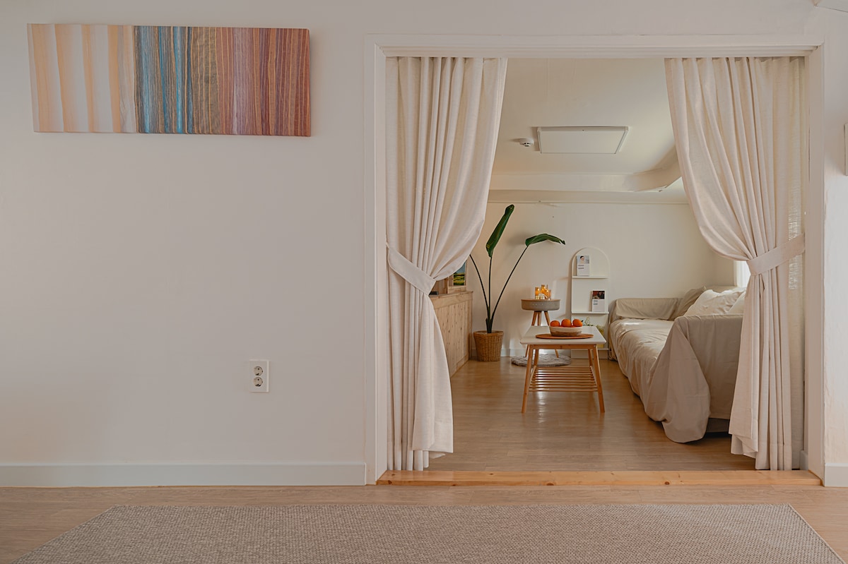 Built in 1866, this authentic Jeju stone house (Hanok style) has been renovated with all modern comfort. Nestled among Gimnyeong alleys, situated on Olle trail no. 20, only 3 mn drive from Gimnyeong beach, it is the perfect place for you to enjoy the authentic island lifestyle. This healing retreat gives you exclusive access to a private house (Ankkeori, courtyard house), and exclusive outdoor hot tub. You will have access to a garden and separate kitchen. Free street parking. Roberta/Youngsoo