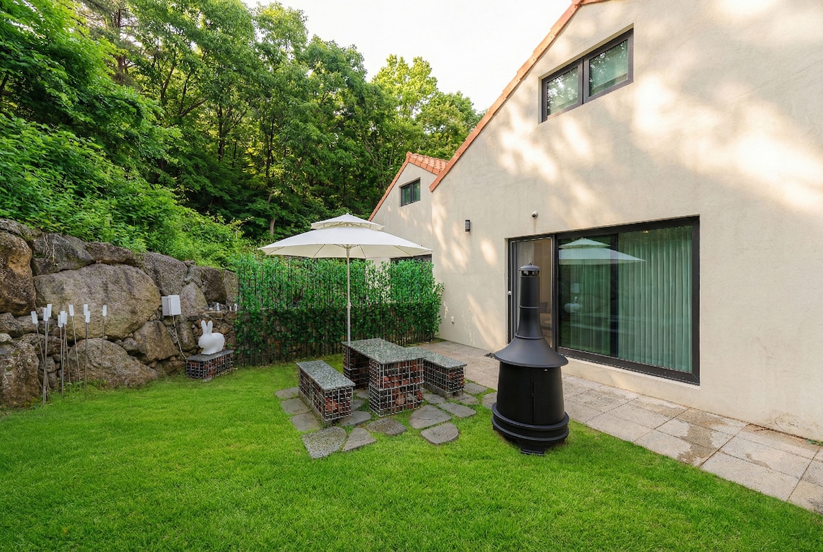 在草坪上嬉戏的家庭独立房屋 / 草坪庭院 / 大型蹦床 / 炭火锅盖炉烧烤 - Bulangistei