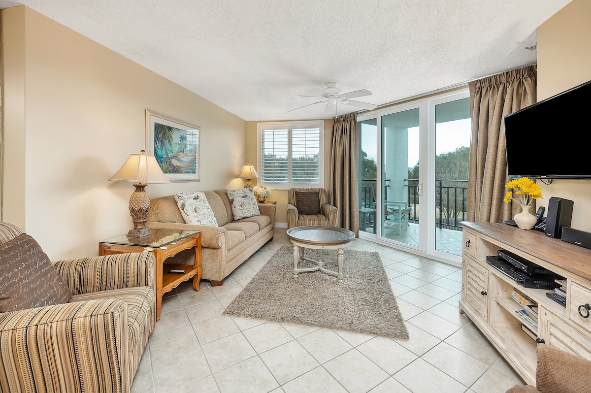 Comfort, relaxation, and beauty await you here - On the quieter and most private side of the Beach Club - with direct, gated beach access . Enjoy our oceanside saltwater pool, 2 hot tubs, and lush gardens - in the perfect spot, on one of the prettiest beaches in the South! Primary suite with king bed, walk-in shower/soaking tub. Second bedroom with 1 queen/ 1 twin, full bathroom. Well-equipped kitchen, full balcony... Come on, the dolphins are waiting for you!