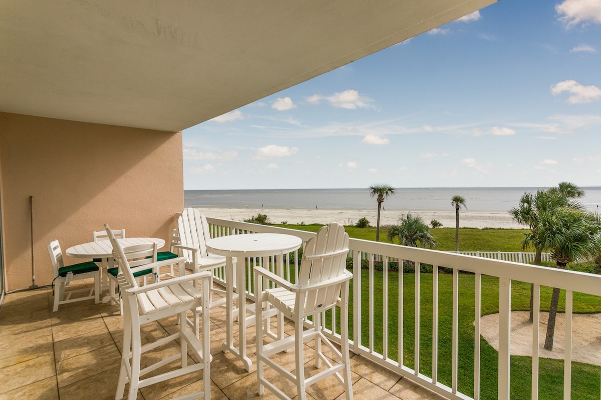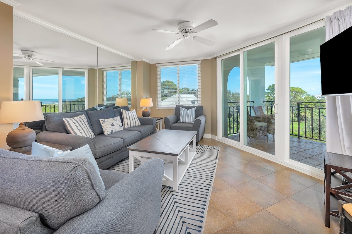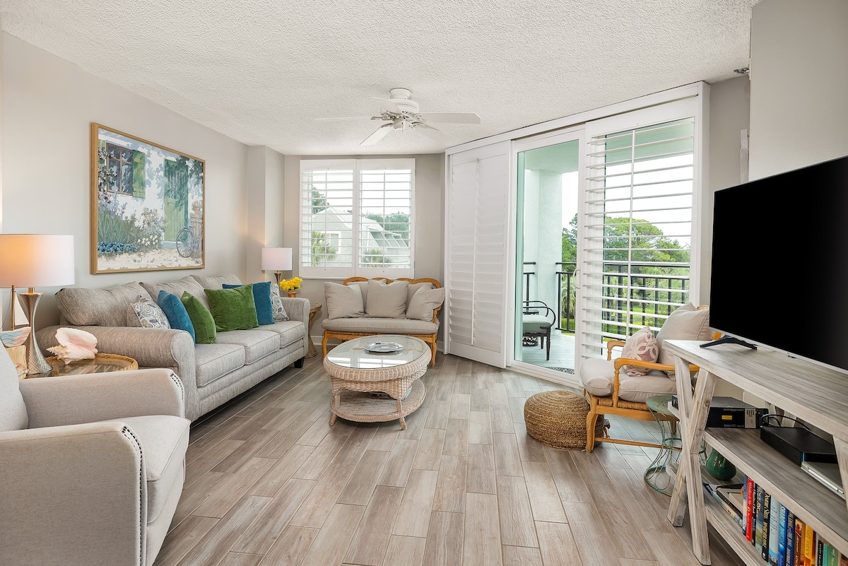 Comfort, relaxation, and beauty await you here - On the quieter and most private side of the Beach Club - with direct, gated beach access . Enjoy our oceanside saltwater pool, 2 hot tubs, and lush gardens - in the perfect spot, on one of the prettiest beaches in the South! Primary suite with king bed, walk-in shower/soaking tub. Second bedroom with 1 queen/ 1 twin, full bathroom. Well-equipped kitchen, full balcony... Come on, the dolphins are waiting for you!
