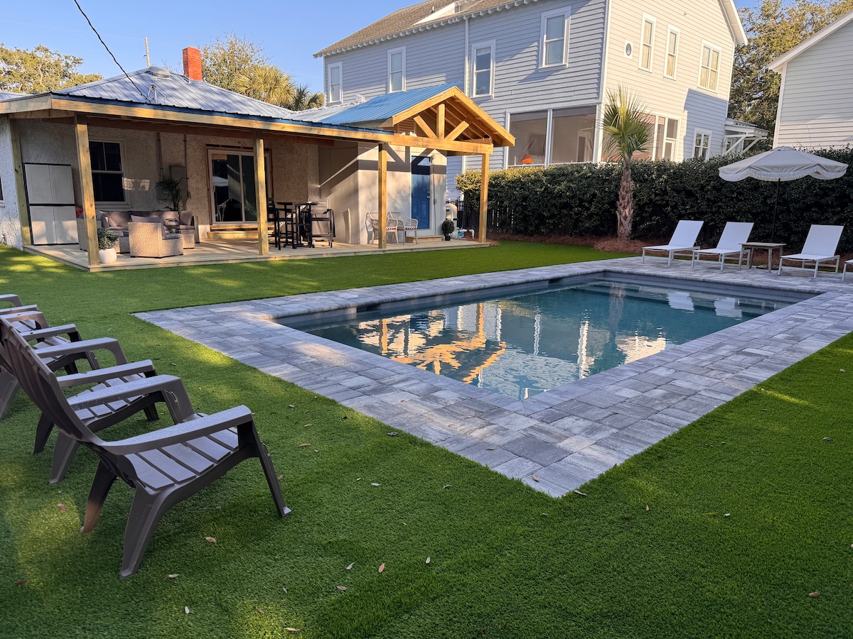 Modern 3BR/2BA East Beach retreat with a brand new pool, huge covered deck AND turf back yard! Sleeps 8 and includes a free golf cart and beach gear. Professionally decorated with airy coastal style, this updated home features an open living space, fully equipped kitchen, spacious yard, and plush bedrooms. Just minutes, 1/10 mile, from the beach, dining, and shopping—perfect for families or friends seeking a stylish, comfortable getaway in one of the island’s most beautiful neighborhoods.
