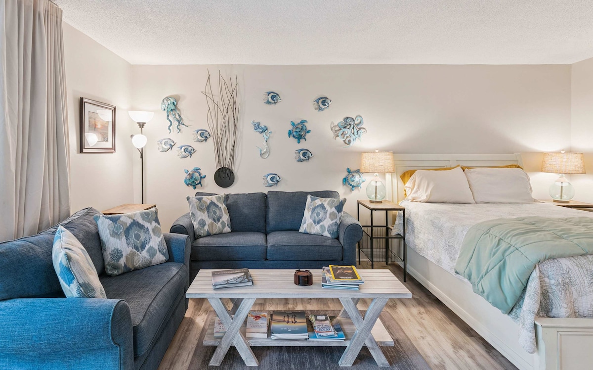 Comfort, relaxation, and beauty await you here - On the quieter and most private side of the Beach Club - with direct, gated beach access . Enjoy our oceanside pool, 2 hot tubs, and lush gardens - in the perfect spot, on one of the prettiest beaches in the South! Primary suite with king bed, walk-in shower/soaking tub. Second bedroom with 1 queen/ 1 twin, full bathroom. Well-equipped kitchen, full balcony... Come on, the dolphins are waiting for you!