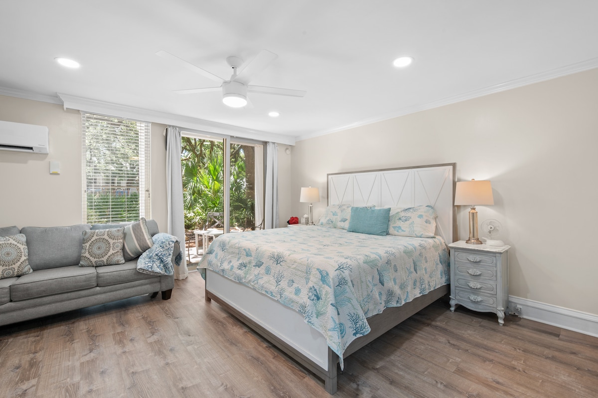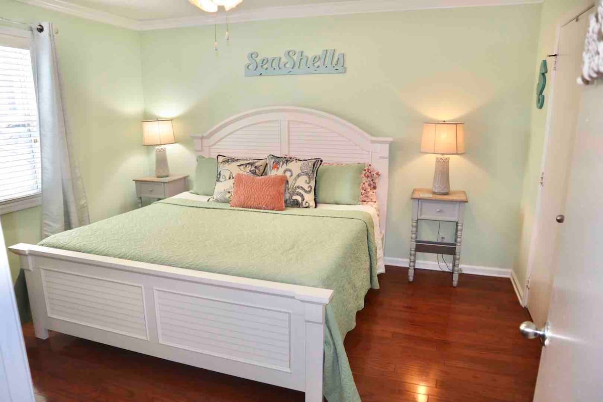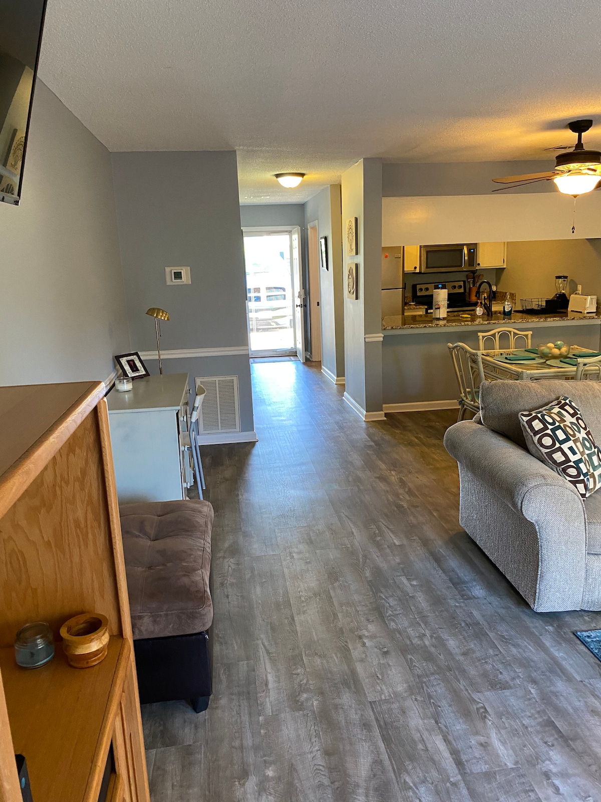 This Ground Floor Island Oasis Condo has been completely renovated from top to bottom with all new furniture and island themed decor including a king sized bed and sleeper sofa which accommodates comfortably up to 4 guests.The kitchen is well stocked with everything you need to cook at home as well as full sized washer and dryer. Beautifully appointed dining room seats 4 guests. Enjoy Free WifI with TV in the bedroom and living room. Relax & make plans for the day by the cozy fireplace.