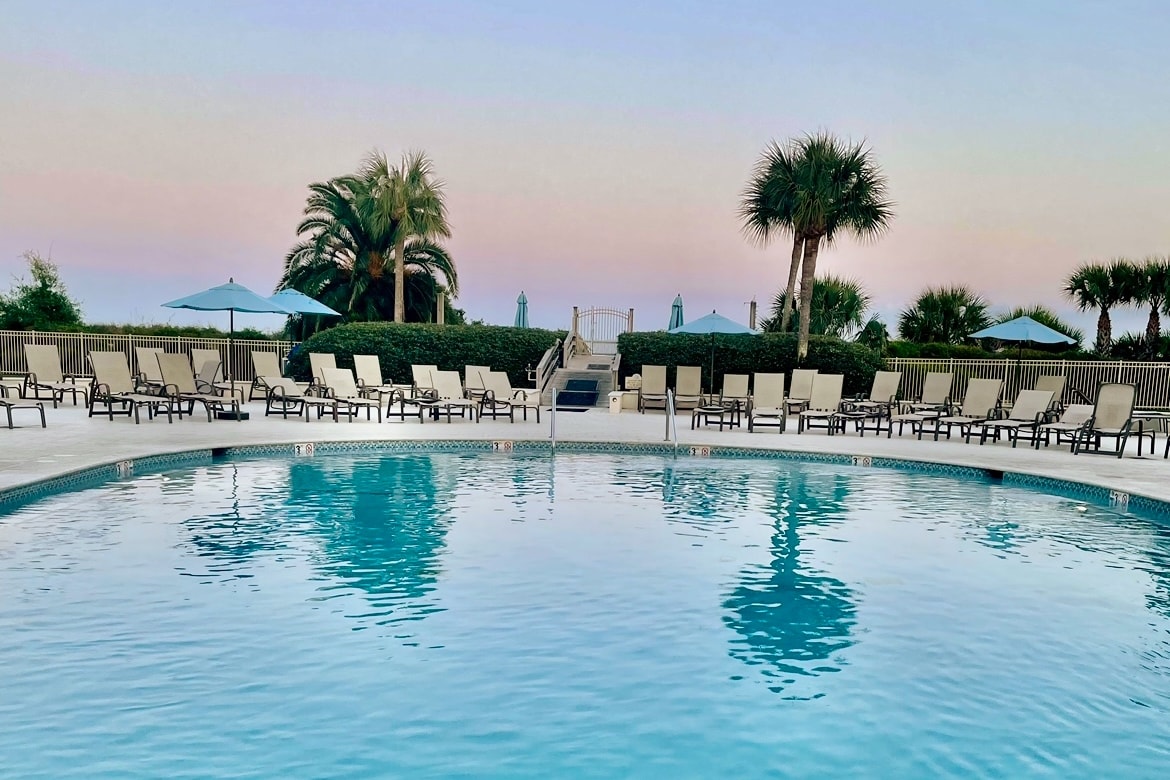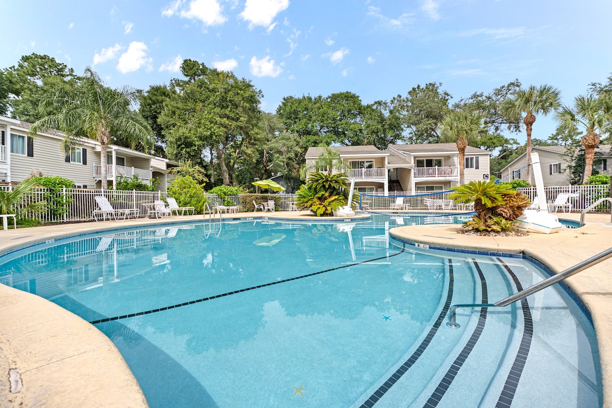 Comfort, relaxation, and beauty await you here - On the quieter and most private side of the Beach Club - with direct, gated beach access . Enjoy our oceanside saltwater pool, 2 hot tubs, and lush gardens - in the perfect spot, on one of the prettiest beaches in the South! Primary suite with king bed, walk-in shower/soaking tub. Second bedroom with 1 queen/ 1 twin, full bathroom. Well-equipped kitchen, full balcony... Come on, the dolphins are waiting for you!