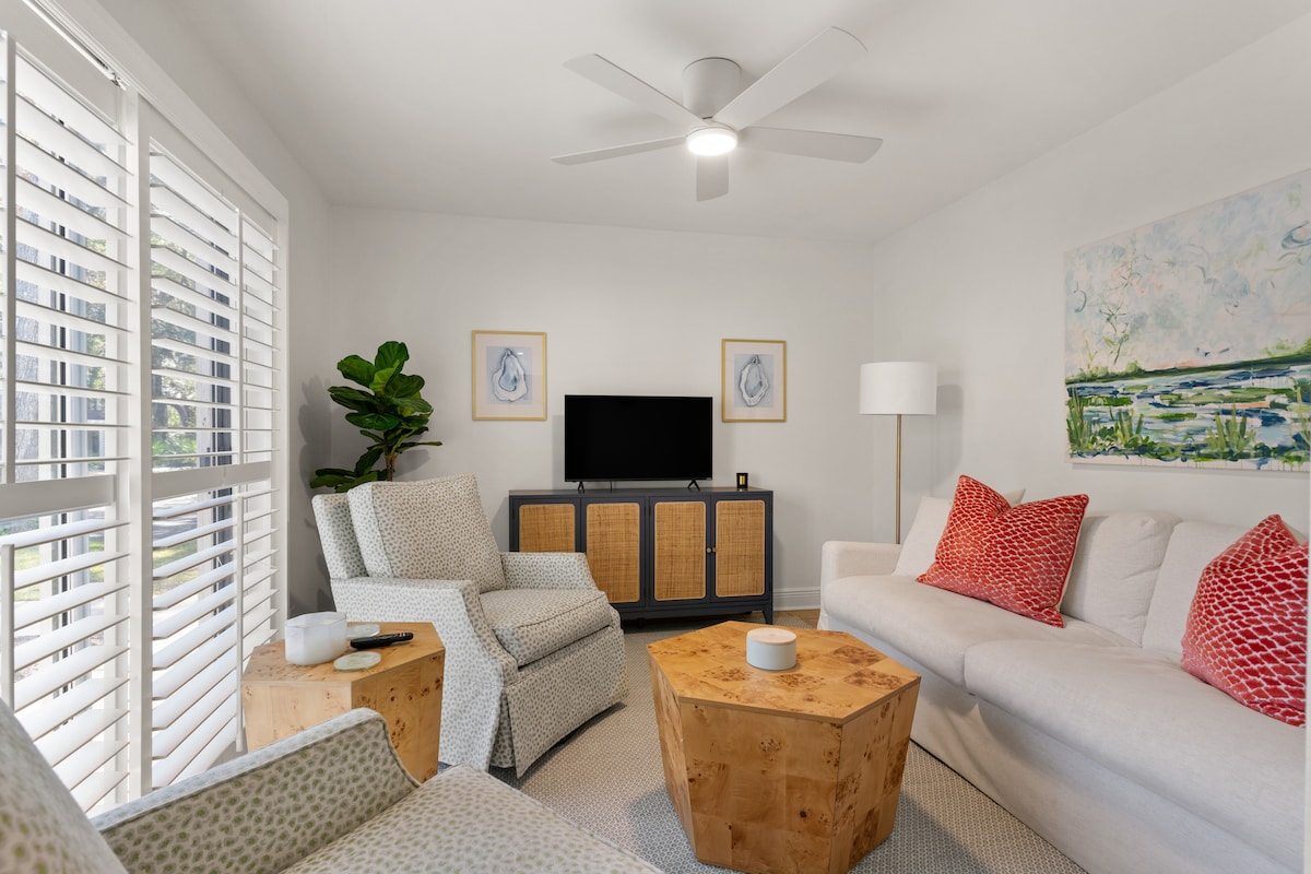 This Ground Floor Island Oasis Condo has been completely renovated from top to bottom with all new furniture and island themed decor including a king sized bed and sleeper sofa which accommodates comfortably up to 4 guests.The kitchen is well stocked with everything you need to cook at home as well as full sized washer and dryer. Beautifully appointed dining room seats 4 guests. Enjoy Free WifI with TV in the bedroom and living room. Relax & make plans for the day by the cozy fireplace.