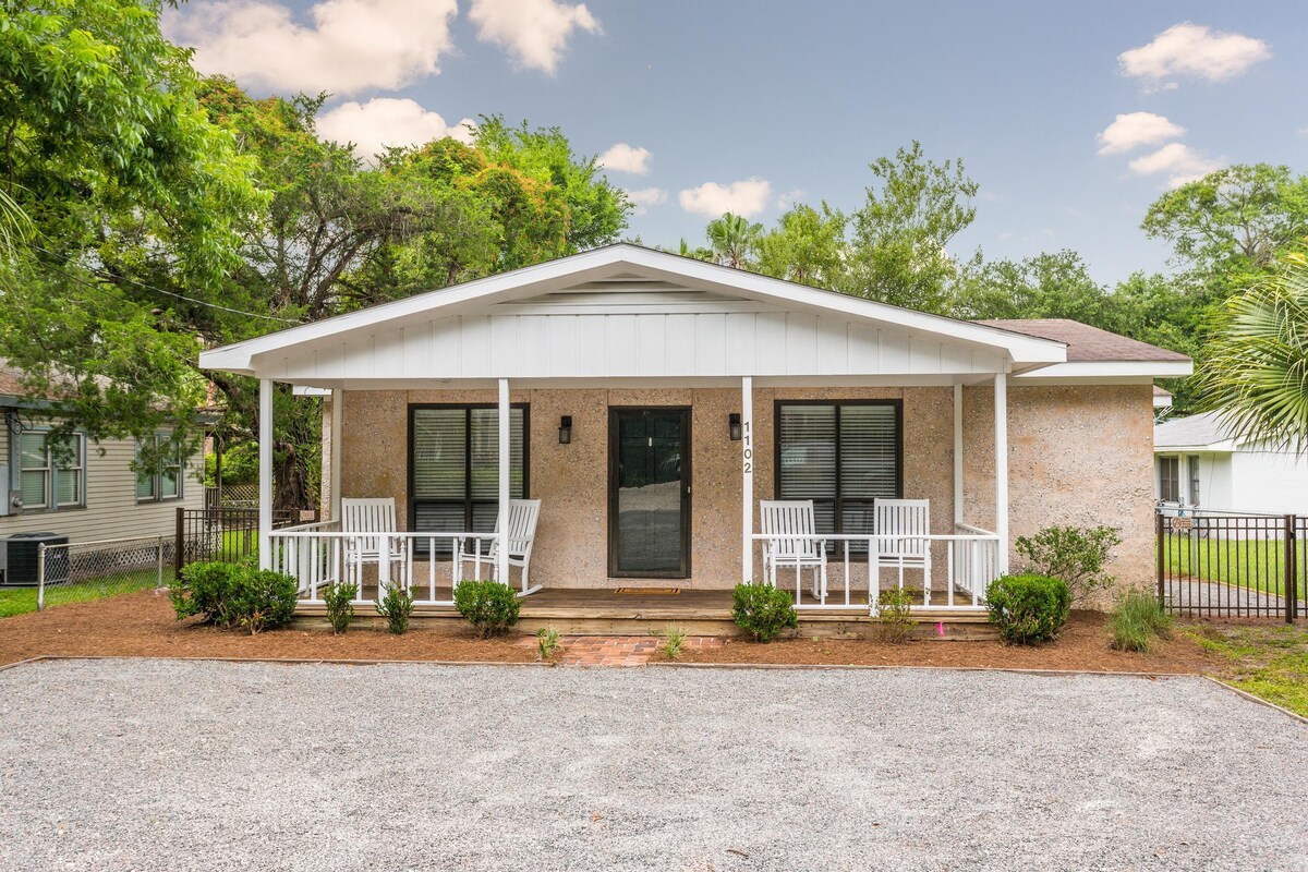 If you want to lay down at night & not hear blaring music or kids partying, this is your spot. If you want to bring your dog on your trip & let them out in the backyard, this your place! I purchased & renovated in 2020 with a new kitchen, new appliances & fresh paint throughout! My cheerfully decorated 2 bedroom, 2 bathroom tabby cottage is enveloped in a canopy of live oaks & spanish moss. The neighborhood is child friendly & safe. The back porch is cozy with romantic lights!