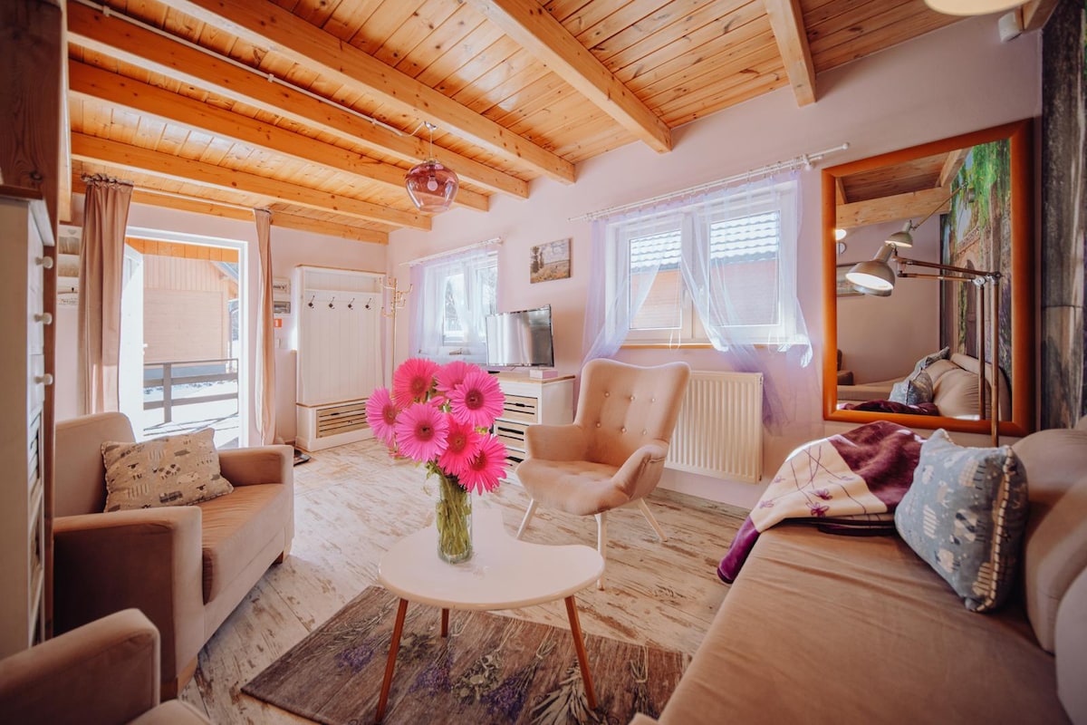 Czego Dusza Pragnie w Zachełmiu to kompleks dwóch drewnianych budynków -chaty z bali oraz drewnianego Domku Mini SPA( 2026). To wyjątkowe miejsce w sercu Karkonoszy zapewnia unikalny mikroklimat i komfortowy pobyt w otoczeniu natury, blisko szlaków, zamku Chojnik i wodospadu Podgórnej. Od stycznia 2026 roku oddajemy do użytku Domek Mini SPA z sauną, jacuzzi, aneksem kuchennym i poddaszem . Całość pomieści do 14 osób i tworzy prywatną strefę relaksu na wyłączność.