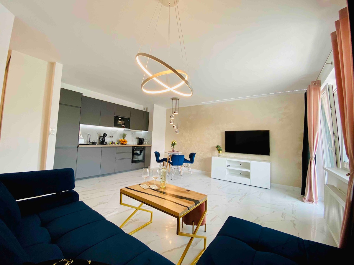Przestronny apartament w nowo wybudowanym budynku z windą w ścisłym centrum Jeleniej Góry. W apartamencie znajduje się oddzielna sypialnia z podwójnym łóżkiem oraz dużą szafą. Salon został wyposażony w duży, rozkładany narożnik oraz w pełni wyposażoną kuchnię i stół jadalniany. Elegancko wyposażona łazienka z prysznicem oraz pralką, a także zagospodarowany balkon. Dla przyjezdnych oferujemy miejsce parkingowe w garażu podziemnym oraz komórkę lokatorską. Wjazd na osiedle zamykany szlabanem.