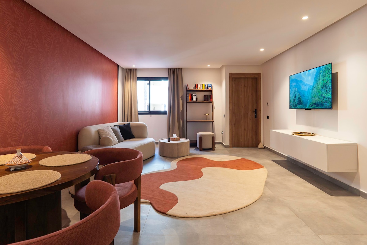 Profitez d'un logement élégant et central. cet appartement est aussi fonctionnel que bien équipé dans une petite résidence à un pas du Carré Eden à Gueliz. Vous pourrez profiter également de moment de détente sur la terrasse aménagée. Enjoy stylish, central accommodation. this apartment is also functional and well equipped in a small residence close to the Carré Eden in Gueliz. You can also enjoy a moment of relaxation on the furnished terrace.