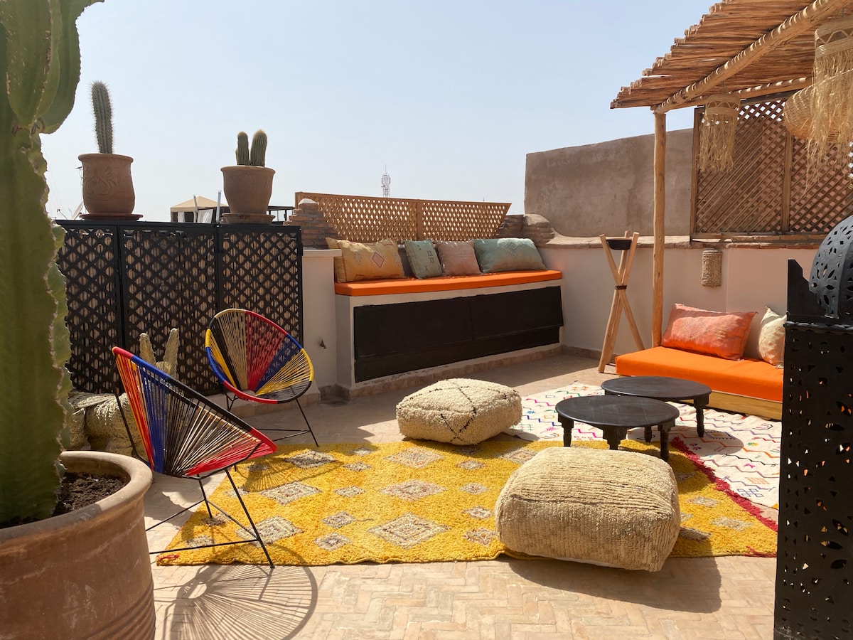 Pépite! Dans un des plus beaux quartier de la Médina, très sûr, près du Palais et à 6/7 minutes à pieds de la porte bab Laksour. Vous séjournerez dans un Riad de rêve avec patio, piscinette et magnifique terrasse aménagée sur le Toit "Entièrement rénové dans un esprit qui allie avec élégance le traditionnel au contemporain. A l'entrée des souks, à 10 mn à pieds de la place Djema El Fna et 20 mn du centre "Gueliz" (vie Nocturne 20 mn à pieds). Taxis à 7 mn à pieds et aéroport à 15mn en voiture