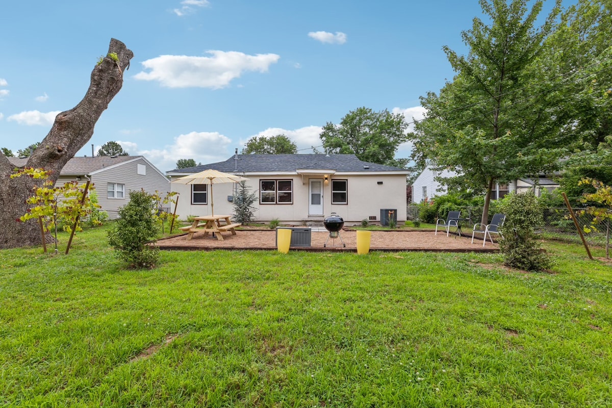 ~This unique place is perfect for entertaining, or just an esthetically pleasing, & peaceful place to enjoy while in Tulsa! ~Outdoor kitchen/grill, firepit, patio w/ furniture, turf & string lights ~ 86" smart tv in living room w/ large sectional ~3 bedrooms, 2 bath, 5 beds ~Sleeps 9 comfortably ~Master: 1 king, private full bath, & walk-in closet, smart TV ~Bedroom 2: Queen bed, 65" smart tv & walk-in closet ~Bedroom 3: 1 twin + bunk beds w/ 2 full beds & 50" smart tv ~ highchair & pack & play