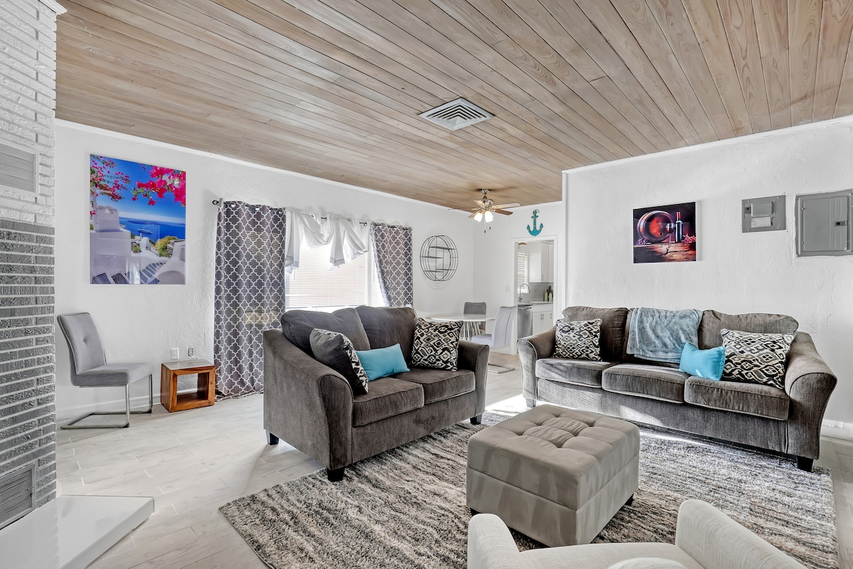 Bring the whole family to this great home with heated saltwater pool. Spa can heat to up to 104 degrees! Family spacious vacation home with your own private salt water poolside retreat in the heart of Jensen Beach, Fl. This 4 bedroom home will accommodate your entire group of 10 in modern luxury. While luxury inside the tropical patio saltwater pool, swing, and cornhole awaits in your backyard with outdoor grill. Only few minutes drive to local shopping or the beach. 50 minutes to PBI airport.