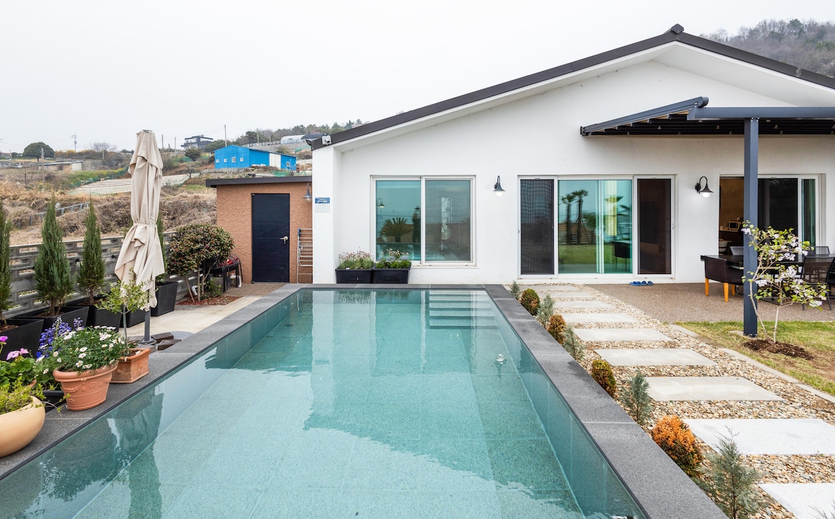 全新改造的酒店式情调住宿 *济州石墙按摩浴缸 *独立泳池别墅 宽敞花园前的游泳池 海景*缪斯之家