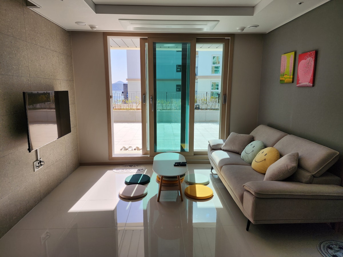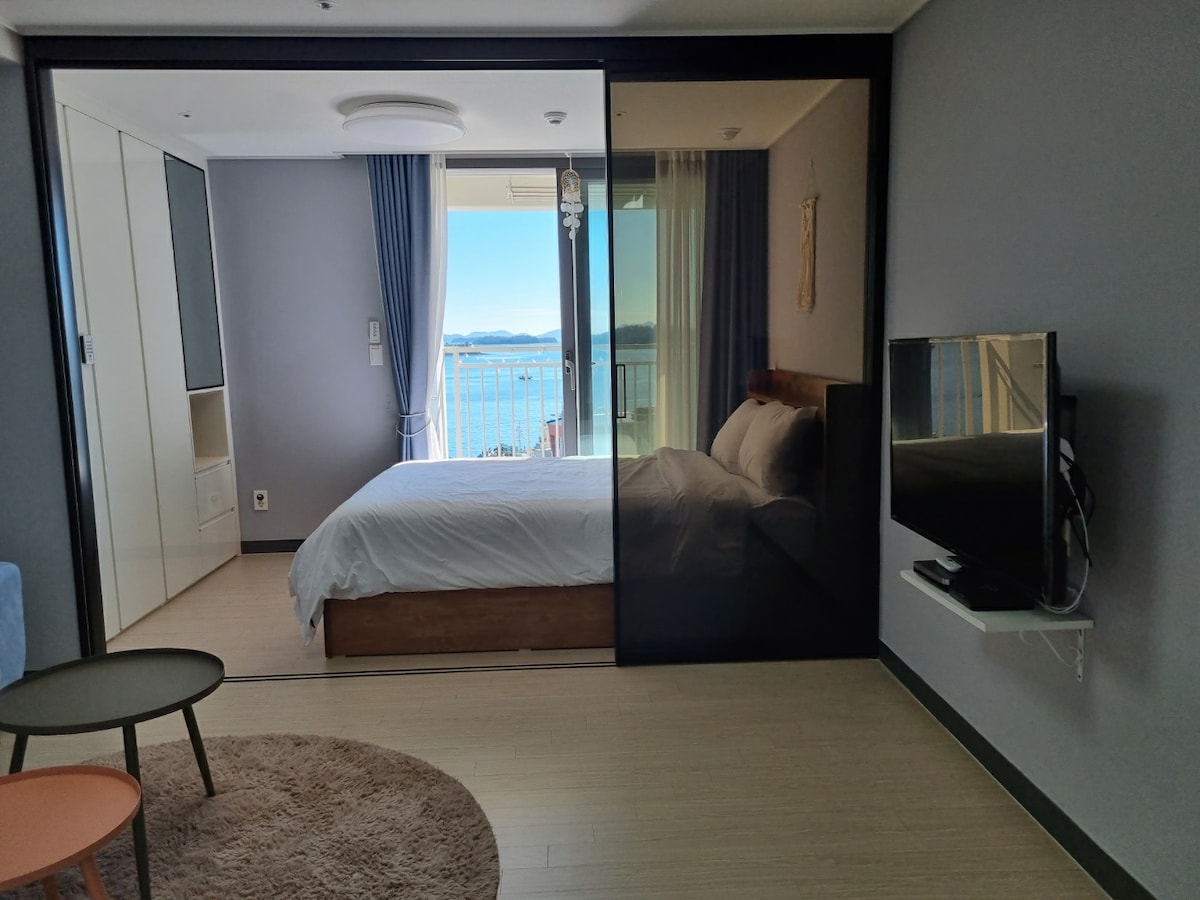 🏝🎆바다 조망의 환상적이 뷰~~ 발코니의 확트인 바다뷰 물멍맛집 따뜻하고 편안한 감성의 cozy숙소입니다. 😊침실 거실 오션뷰예요. 암막커튼 시간마다 느낌이 바뀌는 오션뷰의 남향형 레지던스형 숙소