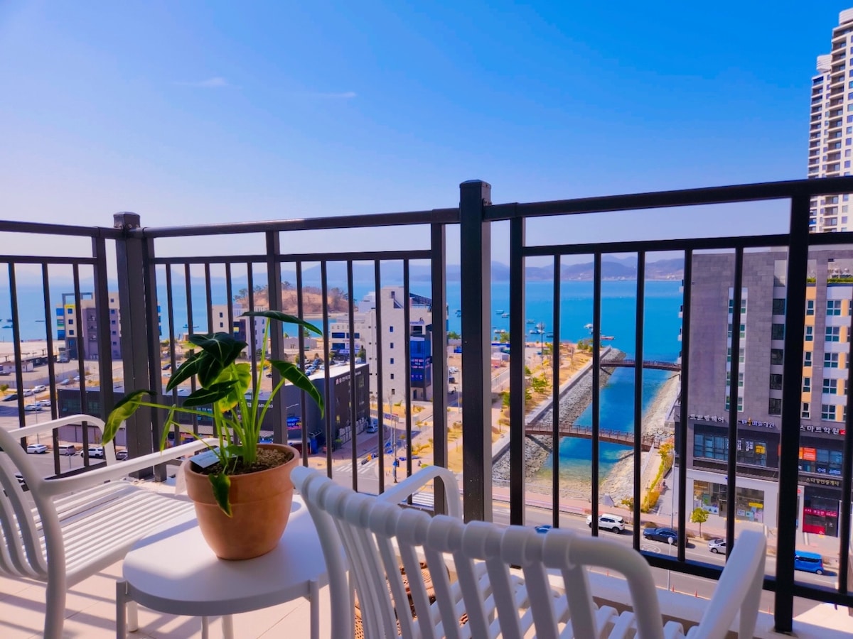 🏝🎆바다 조망의 환상적이 뷰~~ 발코니의 확트인 바다뷰 물멍맛집 따뜻하고 편안한 감성의 cozy숙소입니다. 😊침실 거실 오션뷰예요. 암막커튼 시간마다 느낌이 바뀌는 오션뷰의 남향형 레지던스형 숙소