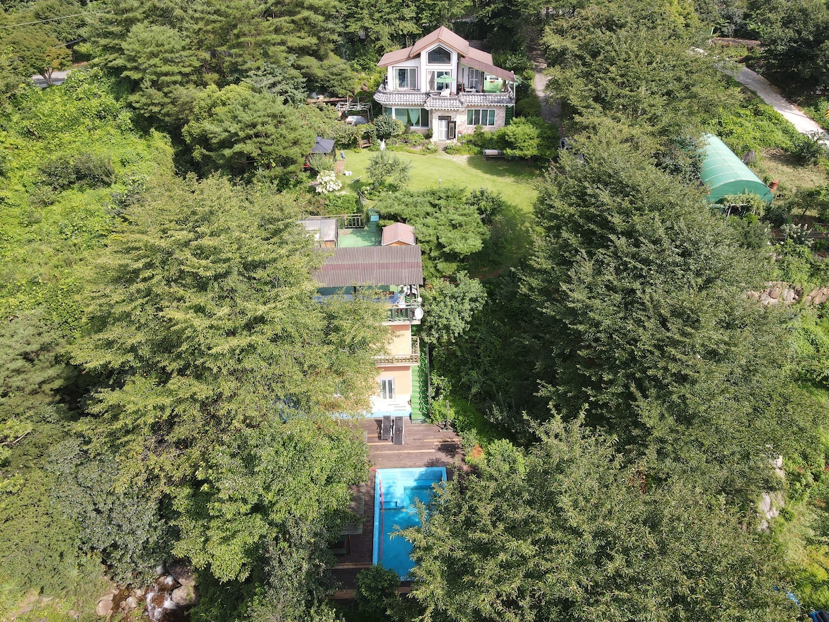宽敞的院子(河东郡),别墅二楼。峡谷、游泳池、家庭聚会,最多可容纳4人