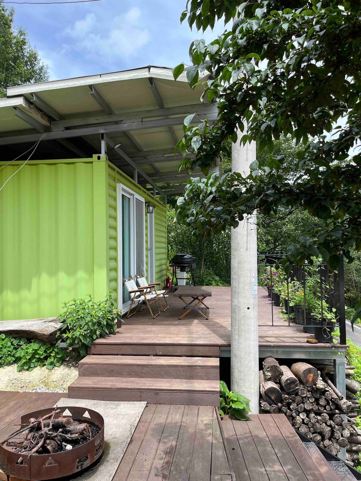 拥有美丽花园、茂盛扁柏林中的木制独栋民宿,韩式暖房