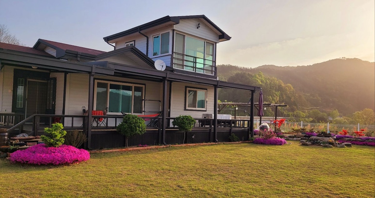 덕유산국립공원과 무주리조트의 번잡한 관광지에서 조금 벗어나 민주지산 삼도봉 아래 420 m 고지에 위치한 여러 과일나무들이 자라는 전원주택입니다. 태권도원, 반디랜드는 10분,덕유산 무주리조트는 25분 정도 걸립니다. 마을 뒷산에선 천혜의 계곡을 즐길 수도 있습니다. 엉클하우스는 서울의 명성있는 목조건축회사에서 직접 설계하고 시공한 최고 단열의 미국식 목구조 건물입니다. 천정이 높고 여름은 시원하고 겨울은 따듯한 집, 사방팔방 높고 탁 트인 뷰, 별뷰와 함께 불멍을 즐기기 좋은 핫플입니다. 1층은 호스트 부부 공간이고, 2층 56m2(테라스 포함)가 게스트하우스입니다. 별도의 출입구가 있고, 호스트가 있어서 불편한 집이 아니라 즉각즉각 도움과 서비스를 받을 수 있어 더욱 호평받고 있습니다. 엉클스타일 바비큐는 본고장 미국인 가족이 '어메이징'을 연발할 정도며, 엉클댁의 곁들인 음식 솜씨는 자타공인 일품입니다. 단독으로 사용하는 야외 벽난로를 갖춘 썬룸은 단연 최고입니다 ♡