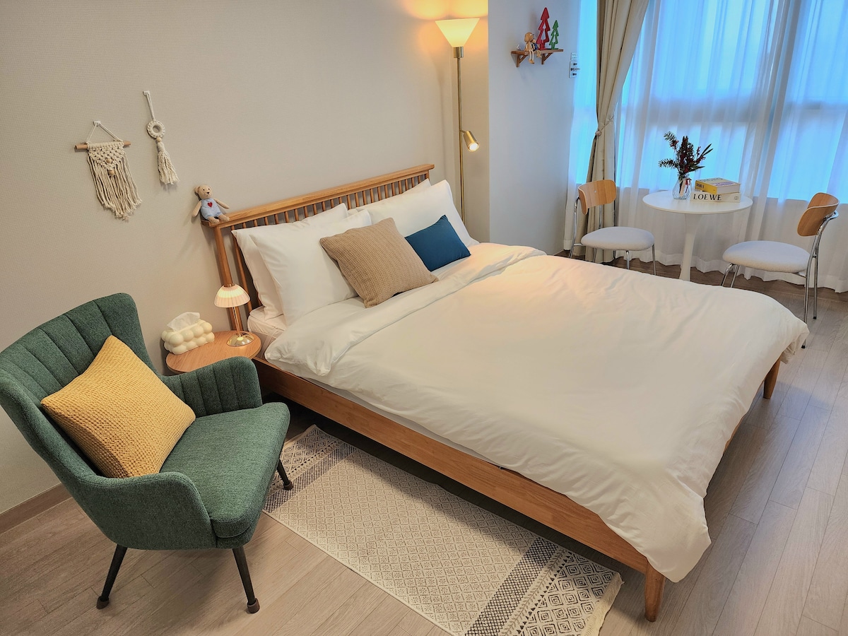 Experience the serene & cozy vibe of Under Cloud—a spacious 50m² home with two charming bedrooms, brick-finished living room, beautiful kitchen & bathroom, extra storage room, and a cozy balcony +hammock. In a quiet yet convenient area, offering easy access to Seoul’s best spots and the airport. Please click “Show more”. ☛ On foot Hongdae: 15min | Hapjeong Stn.(Line 2/6): 8min | 2 Malls: 5min ☛ By bus/subway Incheon Airport: 50min | Old Palaces: 30–40min | Myeong-dong: 30min | Gangnam: 40min