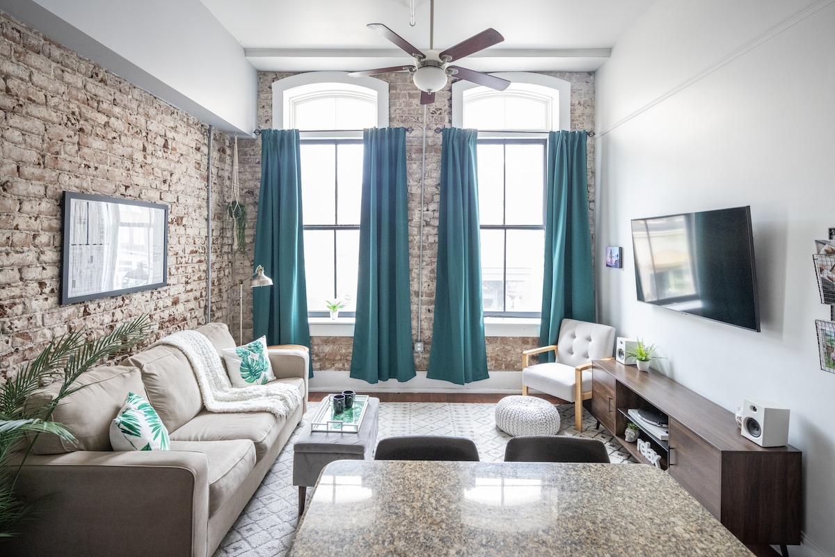 This modern and manicured loft is convenient to everything downtown! Just a few blocks away from the new Plant Riverside District, popular restaurants, and shopping. The loft is located off Broughton Street and just steps away from City Market. Located in the heart of historic downtown Savannah! You won't miss a thing from this location! Newly enhanced, modern, spacious and comfortable. Sleeps 4 guests. One queen bed (new matress), one *BRAND NEW* queen memory foam, pullout sofa.