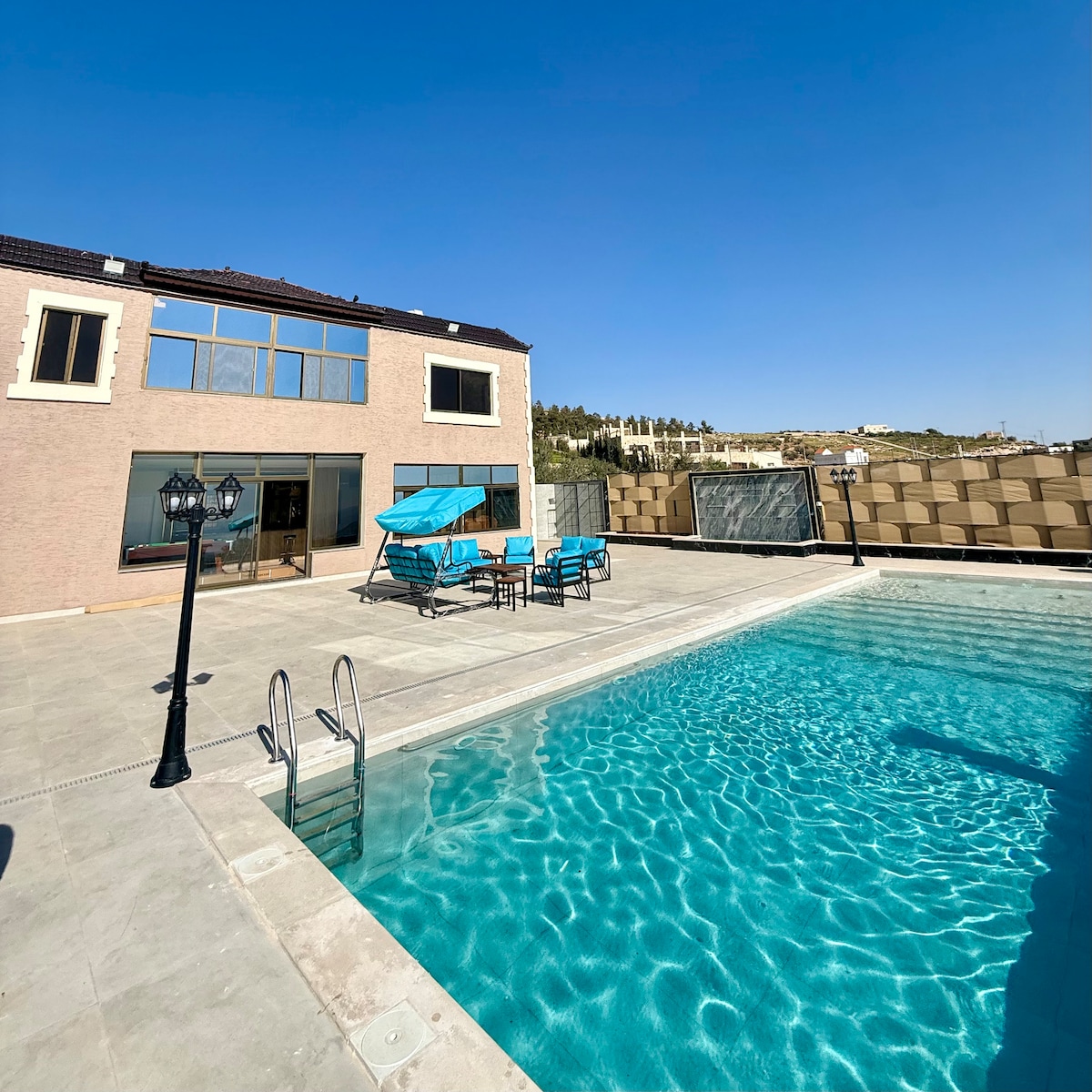 Welcome to this spacious new villa with pool, valley view and lovely outdoor living. This cozy vacation home offers peace of mind and privacy for travelers and vacationers. It is a new property that offers luxury amenities. We are adding to the experience the option to request a jordanian village breakfast in the mornings. Food deliveries are available in the area making the stay more care free. We advise you to have your own vehicle. Airport car rental is recommended.