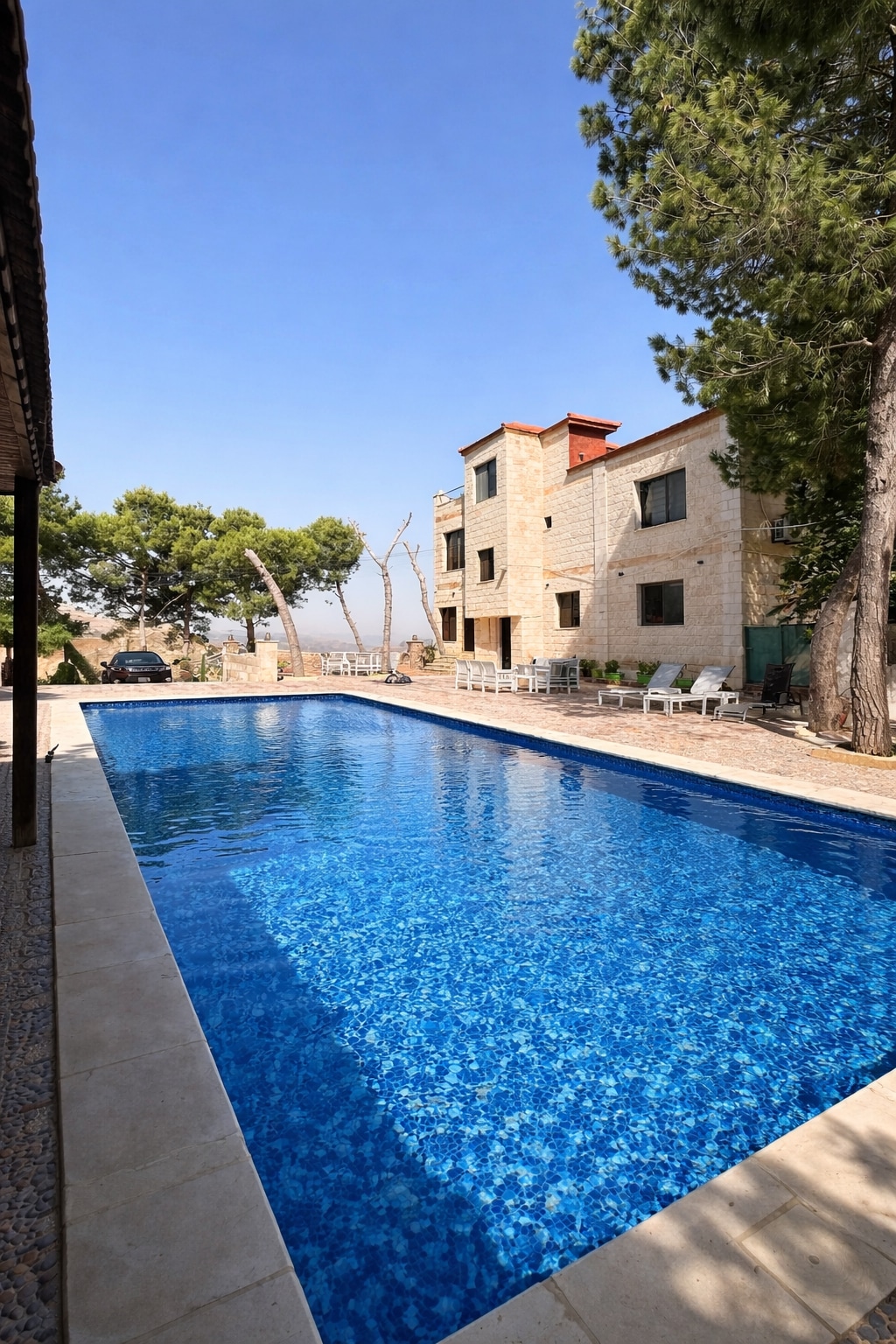 Royal Palace Farm is a private luxury retreat on Jerash Road, just 25 minutes from Amman and 5 minutes from Philadelphia University. It features beautiful open views, a large private pool, wide green spaces, 5 bedrooms, 3 living rooms, indoor and outdoor bathrooms, and a fully equipped kitchen. Bright white linens and towels add a clean and elegant touch.
