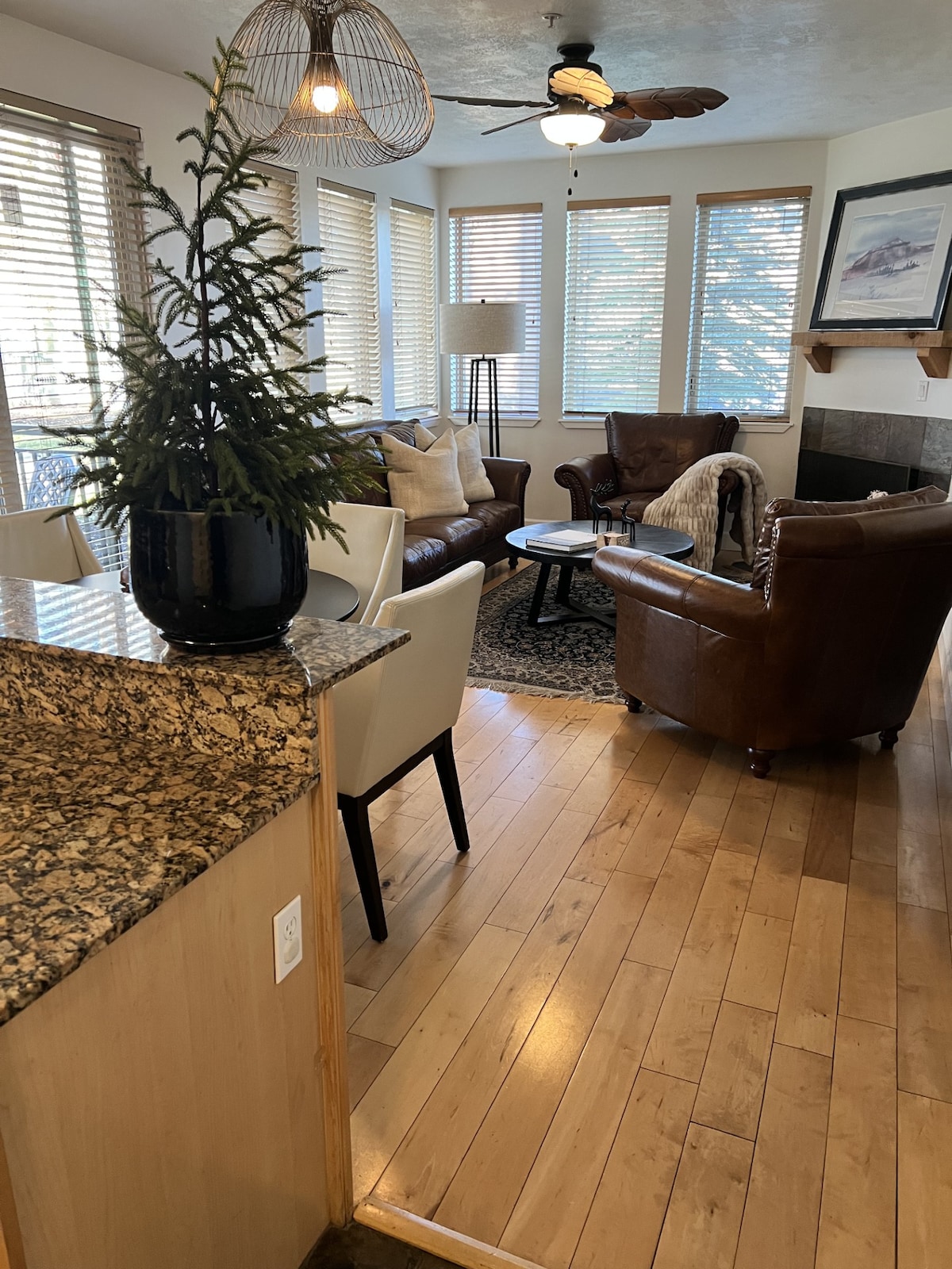 Relax in this beautifully designed two-level mountain condo at the base of Canyons. This family-friendly home has been thoughtfully designed, blending modern chic with a cozy rustic mountain feel, including vaulted ceilings with exposed wood beams and a stone fireplace. Located a short walk to the Cabriolet lift, there is no better starting point for your mountain adventures. Return home for a comfortable evening by the fire and your own private patio for grilling and taking in the views.