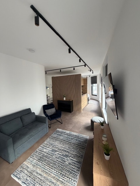 Our spacious studio apartment is just a two minute walk to the beach and a short stroll along the sea front to the popular harbour village of St Aubin. The split-level studio is on the first floor in a separate part of our family home. The bedroom is located on the upper level with sea views towards St Aubin’s Bay. The open-plan kitchen and living area is on the lower level with views across a quiet residential lane towards fields where you’ll often see Jersey cows grazing.