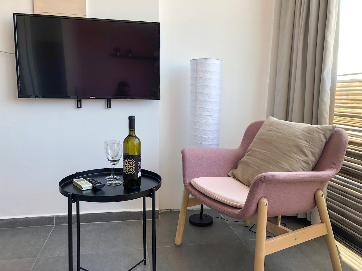 Upon returning home from Banana beach or Carmel market, each 2 min by foot, w/your grocery bags/bathing suits, you enter your seaview apartment, hang your wet things on the balcony, or in the shower in the stone bathroom. Take a hot shower then sip some wine, kick your feet up on the deck or in the bedroom or watching your favorite movies on the HD widescreen or in the bedroom TV. The late night sounds you hear from the 6th floor are the waves.