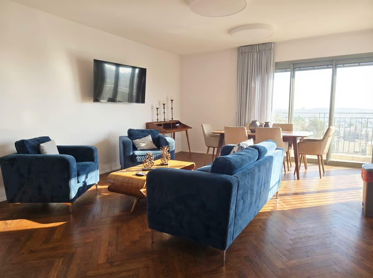 This beautifully designed home features a 60 sqm private balcony, suitable for a Sukkah, and offers comfort and elegance throughout. The apartment includes 3 bedrooms with queen-size beds and additional pull-out beds, accommodating up to 9 guests, each with a private en-suite bathroom. Enjoy a fully equipped kitchen with a Shabbat refrigerator, a stylish living area with a sofa bed and 55” Smart TV, washer/dryer, and two private parking spaces—perfect for an unforgettable Jerusalem stay.