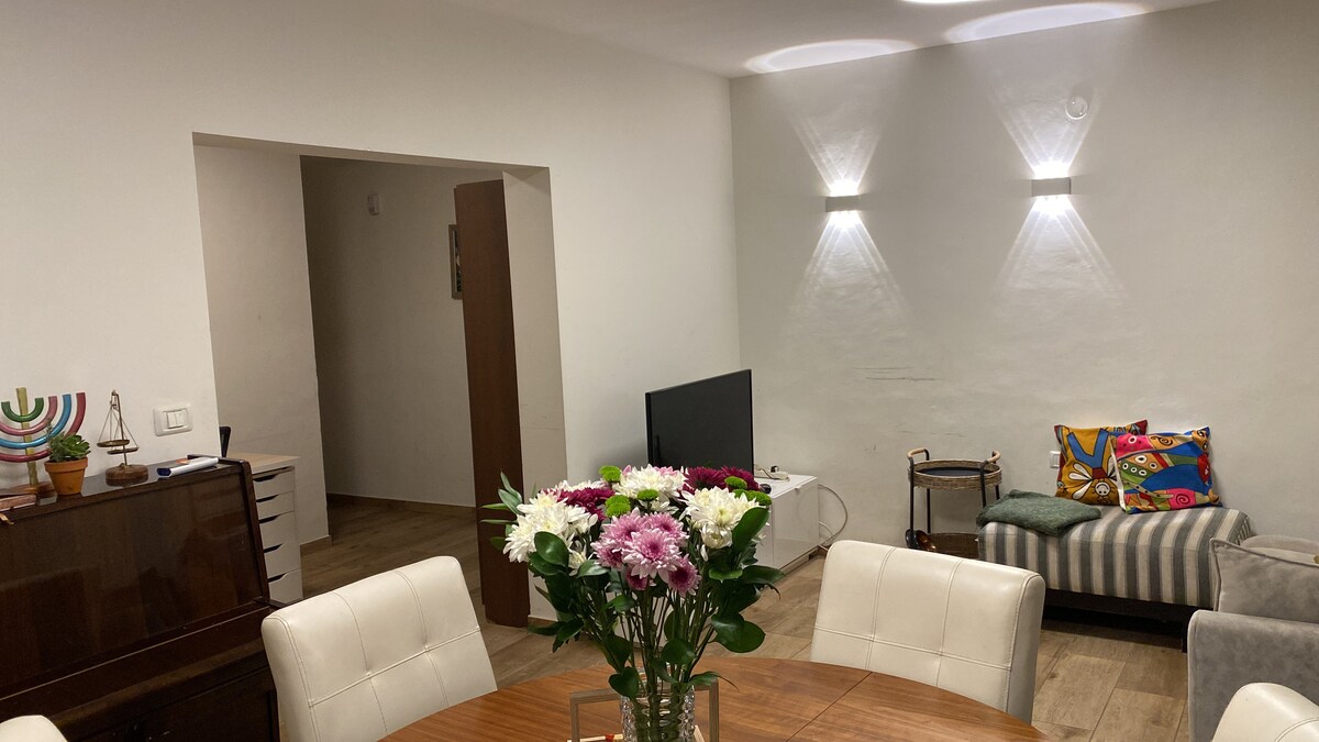 Studio apartment with free parking in a quiet neighborhood with a beautiful garden. Very easy access to public transportation . Also, there is a supermarket and grocery store 3 minutes away by foot. The apartment is split between a sitting and a sleeping area, a separate kitchen, and a sunny dining /sitting space. The studio can sleep two people comfortably: two single beds . Home made Palestinian Breakfast and Middle Eastern meals are available on demand.