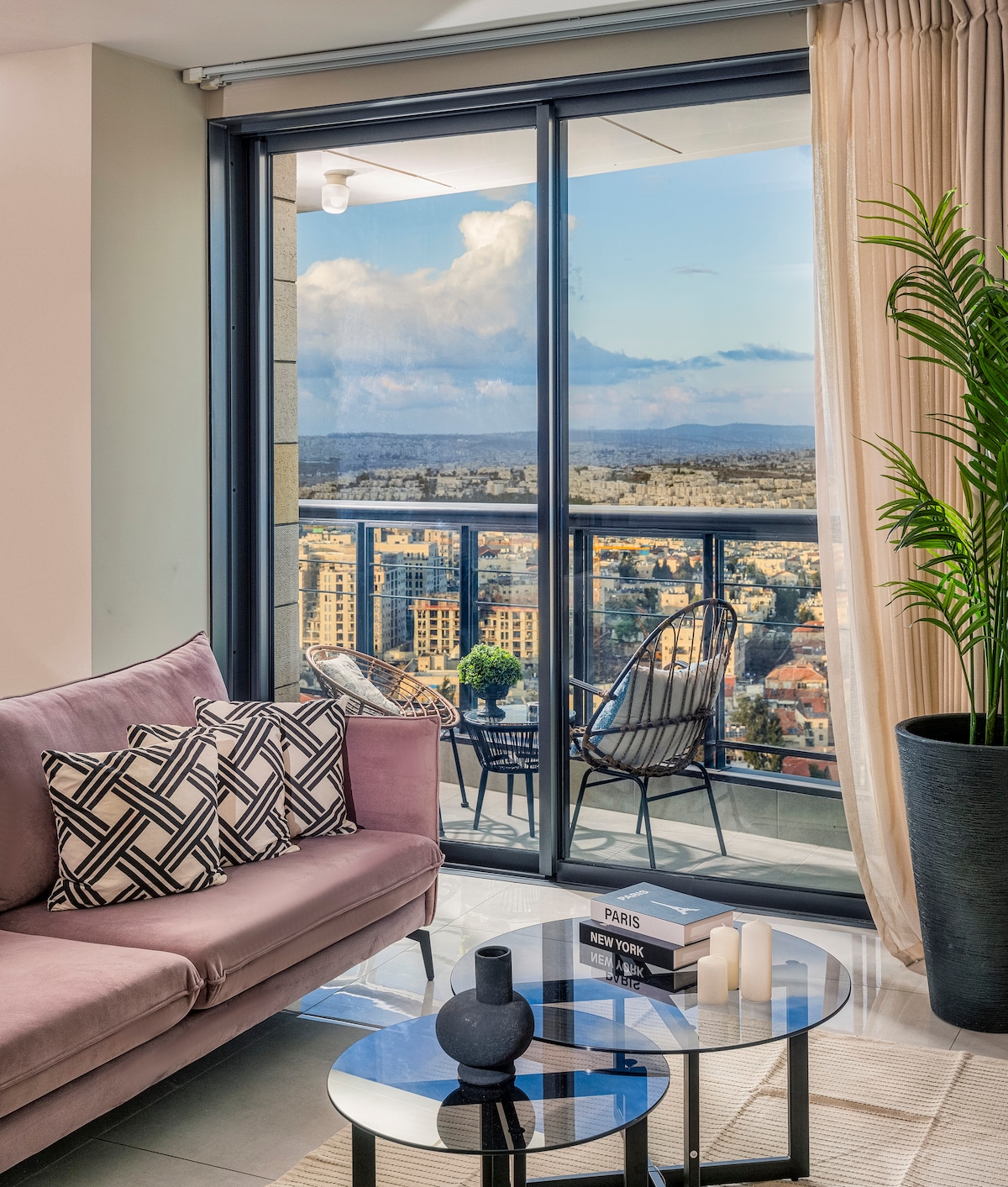 This sleek apartment overlooks magical Ha-Nevi'im Street, home to the famous Jerusalem landmarks of Davidka Square, the Italian Hospital and Tabor House. Be enchanted by the ancient stone homes surrounded by gardens and walls, walk over to the nearby Old City and Russian Compound, or stroll the lively pedestrian-only Ben Yehuda Street. You can catch the Jerusalem Light Rail to the Central Bus Station, where you can ride the Tel Aviv-Jerusalem railway to Ben Gurion airport in under half an hour.