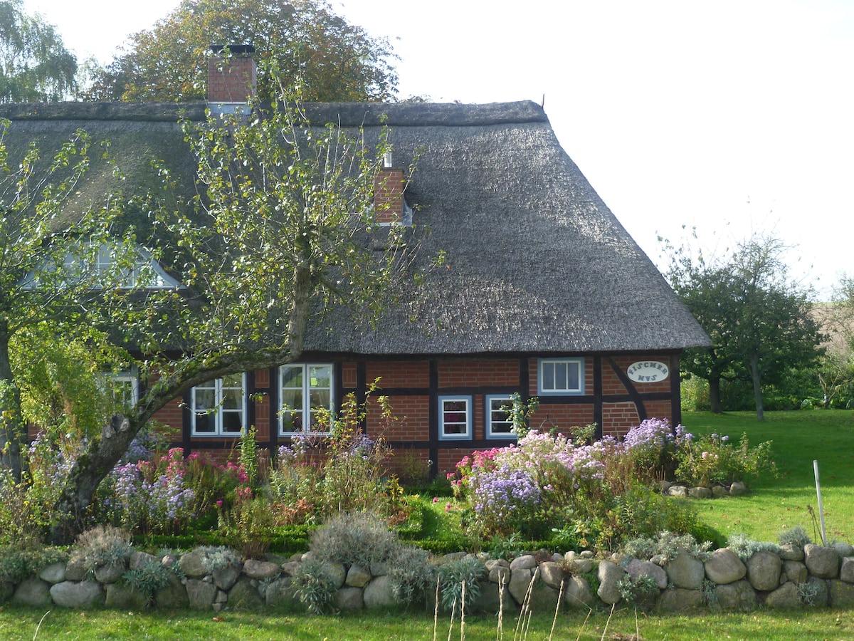 Ferienwohnung BehrenSCHLAF im reetgedeckten Bauernhaus übernachten und gut erholt Natur und Landschaft entdecken. Das um 1780 als Rauchhaus errichtete Bauernhaus steht unter Denkmalschutz und wurde liebevoll erhalten. Ihr übernachtet in unserer gemütlichen Ferienwohnung mit Terrasse zur Südseite und Blick in unseren Garten. Ein Doppelbett sowie ein klappbares Schlafsofa lassen 2 Gäste gemütlich schlafen, aber auch 4 Personen sind gut möglich. Wir freuen uns auf Euch! Eure Familie Behrens
