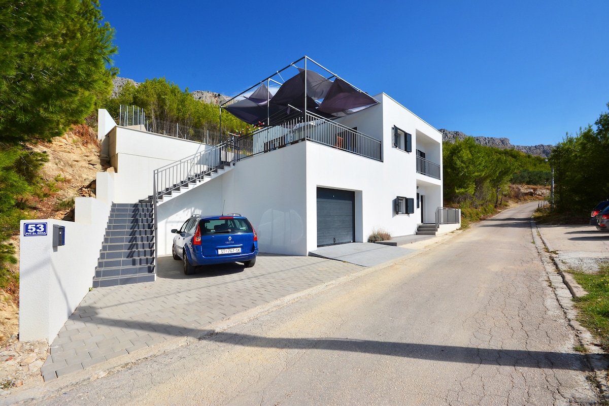 Villa Grey is beautifully designed with so many glass doors and windows offering nice sea views, a very bright and pleasant interior with sun in every corner, furnished with style and elegance. The house is located above the coastal road and a car is highly recommended to get anywhere (due to a bit of a steep location), but the location offers a beautiful view of the Adriatic Sea, the mountain behind, and the island of Brač. The nearest mini market, restaurant, bar is within 2km.