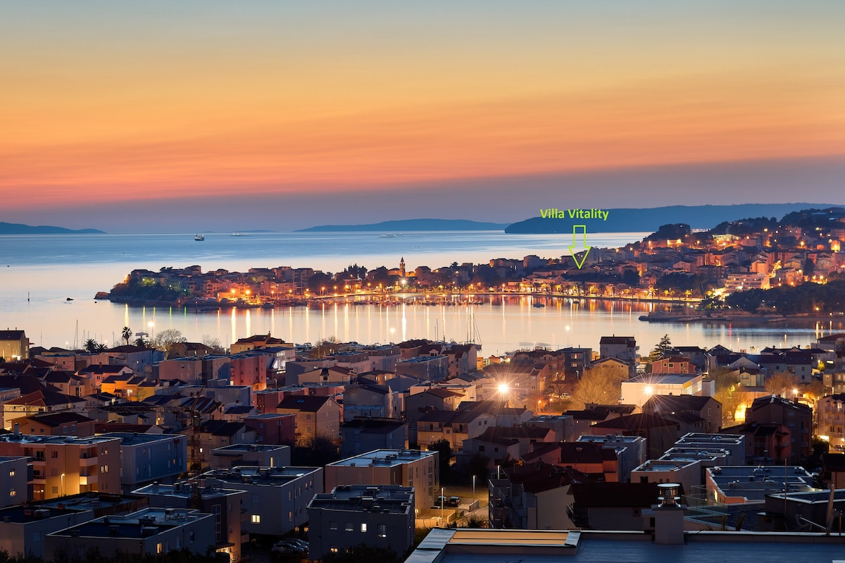 Royal is new, modern & luxury renovated apartment with jacuzzi, 50 meters away from beach. Has 50 square meters and 30 square meters terrace. Comes with 2 bedrooms, a living room, a fully eqipped kitchen with a dining area, bathroom with great shower, barbecue facilities, garage(1 car) , flat-screen TV in every room and free wi-fi. Offers a big terrace with open sea view on surrounding islands. Diving can be enjoyed nearbly. Trogir is 5 km away and Split airport 8 km from the acommodation.