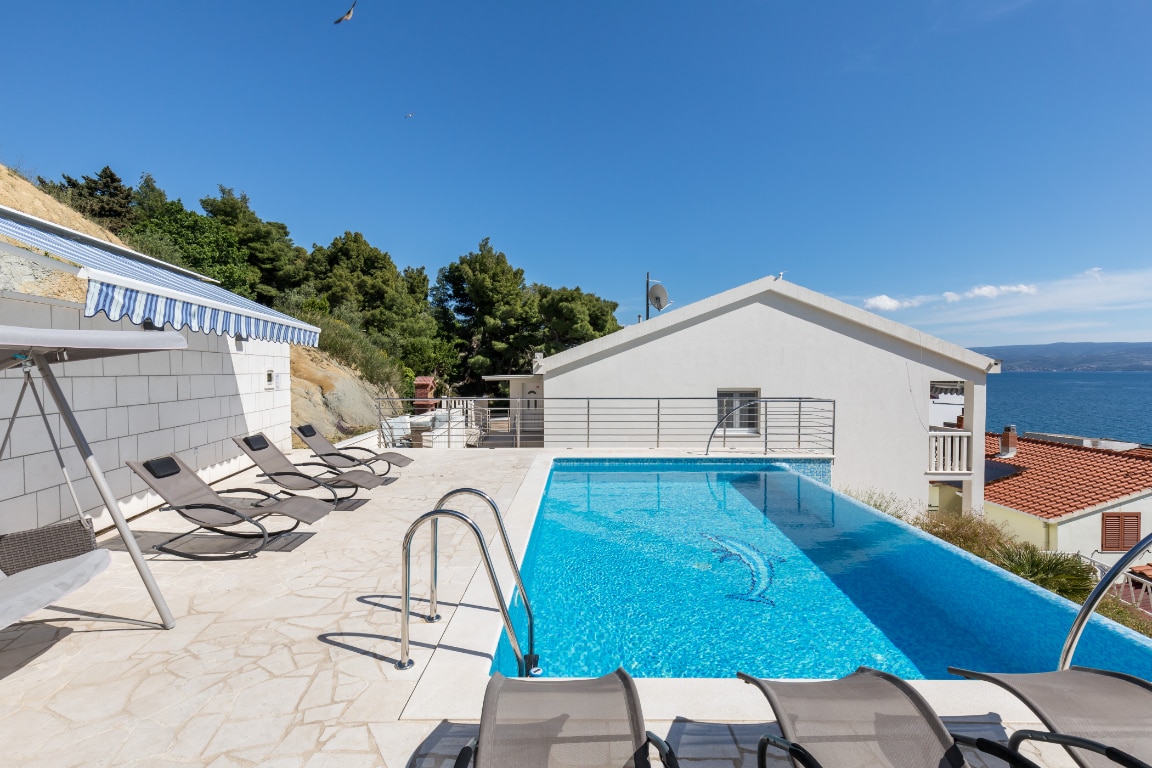 Villa Grey is beautifully designed with so many glass doors and windows offering nice sea views, a very bright and pleasant interior with sun in every corner, furnished with style and elegance. The house is located above the coastal road and a car is highly recommended to get anywhere (due to a bit of a steep location), but the location offers a beautiful view of the Adriatic Sea, the mountain behind, and the island of Brač. The nearest mini market, restaurant, bar is within 2km.