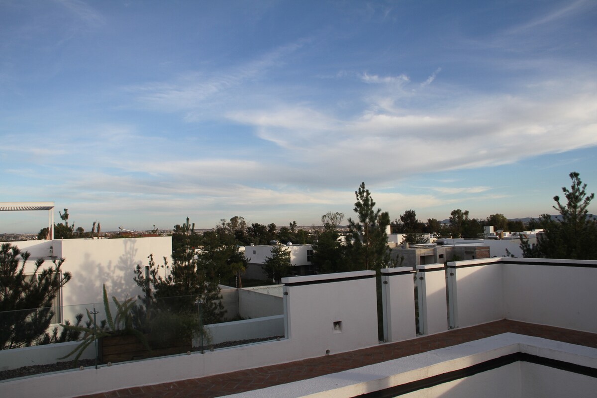🌟Situated to the north of Aguascalientes, this house is the perfect place for family vacations and business trips 🛍️Close to Altaria Shopping Center and Aguascalientes Industrial Park (PIVA) 💪Relax in an exceptional space and enjoy top-notch amenities: gym, pool, jogging track, tennis courts, soccer and basketball courts, playground for children, and playroom 🏡The house features a fully-equipped kitchen, cozy bedrooms, and a workspace. We look forward to welcoming you soon!